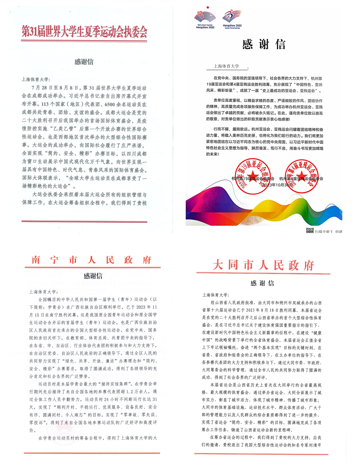 本网讯 2023年7-8月,第31届世界大学生夏季运动会在成都成功举办;9-10月,第19届亚运会、第4届亚残会在杭州成功举办;11月,第一届全国学生(青年)运动会在南宁成功举办;同年8月,山西省第十六届运动会在山西大同举办。应上述运动会组委会、执委会和承办地人民政府的邀请,红足一1世刘清早教授分别担任了“成都世大运会执委会特聘专家兼大运村首席专家”“杭州亚(残)运会组委会顾问兼亚(残)运村首席专家”“南宁全国学青会运动员村首席专家”“山西省运会大同市筹委会首席专家”,带领研究生王祁、朱墨桢,本科生左鸿滔、陈睿以及专业技术人员刘潇洋担任“首席专家助理”,组成首席专家团队为运动会的成功举办提供了全程、全方位的专业技术服务。