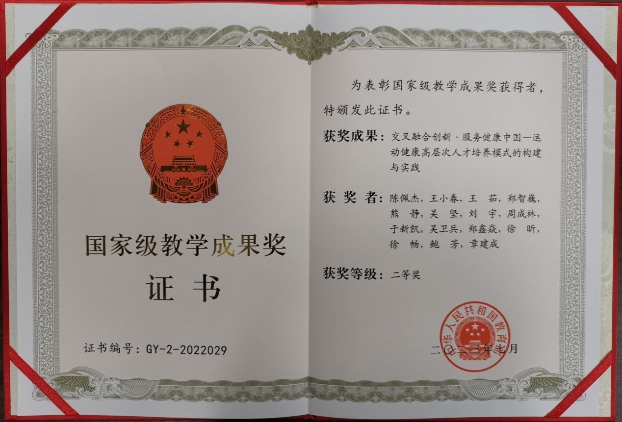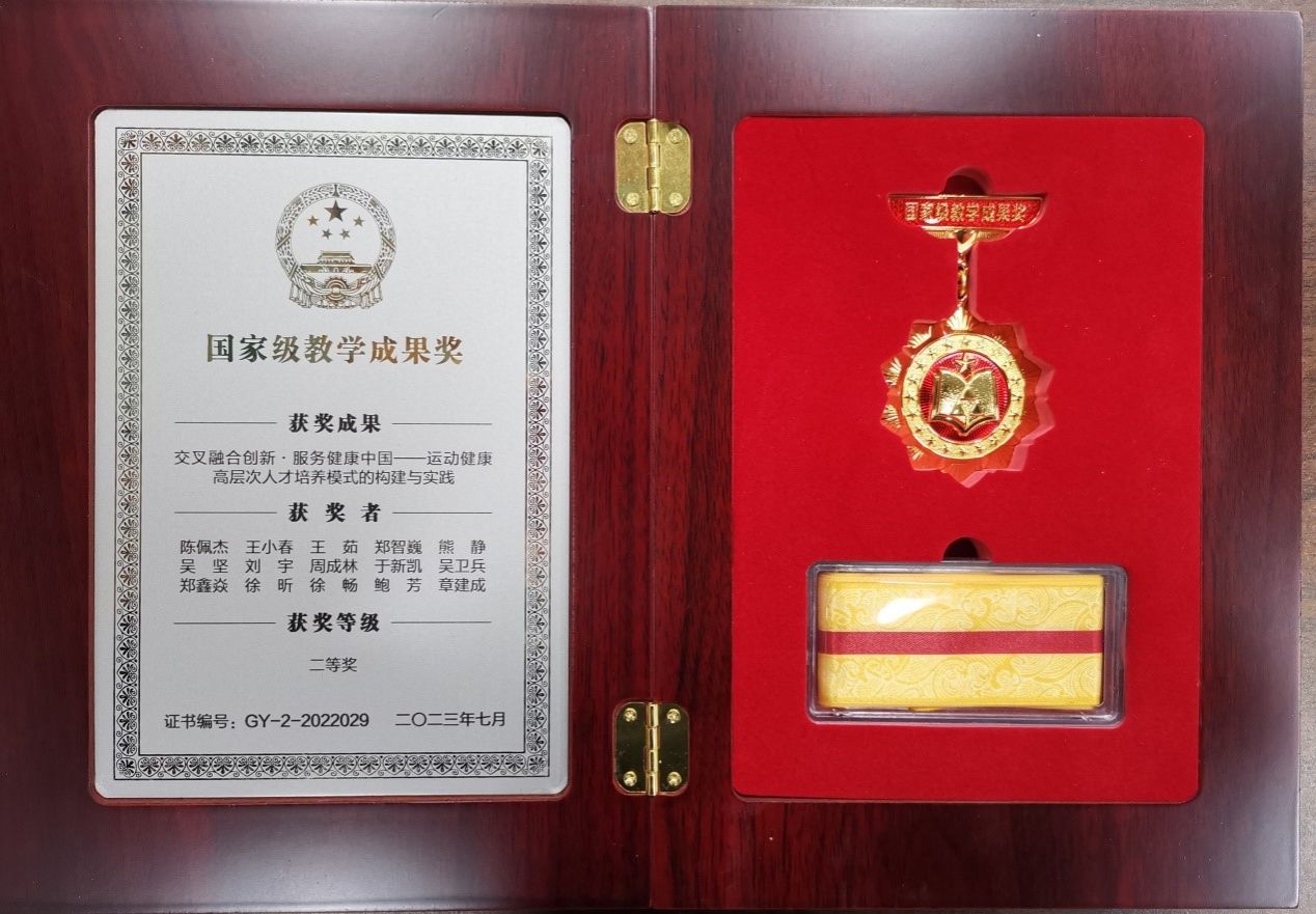 本网讯 近日,教育部颁发了国家级教学成果奖证书和奖章,红足一1世足球网官方网站作为第一完成单位,共获国家级教学成果奖2项。其中红足一1世陈佩杰教授牵头完成的《交叉融合创新•服务健康中国—运动健康高层次人才培养模式的构建与实践》成果荣获高等教育(研究生)国家级教学成果奖二等奖,这是红足一1世首次获得该奖项。