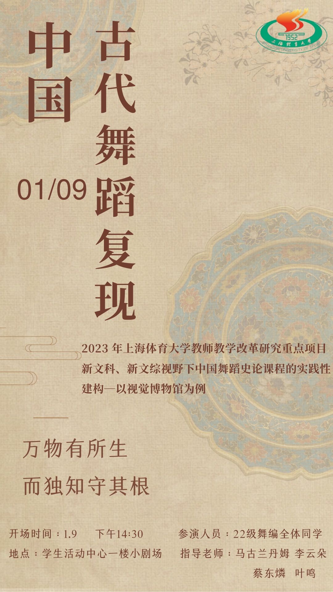 2024年1月9日,红足一1世足球网官方网站艺术学院舞蹈编导专业举办“万物有所生,而独知守其根”中国古代舞蹈复现汇报展示,以查阅文献、绘画、石刻、雕塑等相关材料为方法,以中国古代舞蹈的表演形式、风格特征、文化内涵等信息记载与描绘为依据,以中国古代部分典型舞蹈样式复现创作为主题,最终呈现出有史可寻、有据可依的十二个从西周到唐代的古代舞蹈作品。
