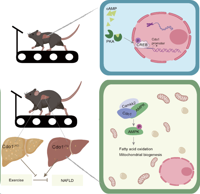 非酒精性脂肪肝的患病率逐年升高,日益威胁人群健康。作为一种有效预防和治疗脂肪肝的方法,运动锻炼逐渐受到人们的重视。郭亮教授课题组首次发现肝细胞中的半胱氨酸双加氧酶1(Cdo1)是运动的下游效应分子,其可促进运动对高脂饮食诱导的小鼠非酒精性脂肪肝的缓解作用;揭示了Cdo1-Camkk2-AMPK轴抑制肝细胞脂肪变性的新机制;有助于阐明运动缓解非酒精性脂肪肝的分子机理,为运动干预脂肪肝进展、精准运动防治脂肪肝提供理论依据和新的分子靶点。