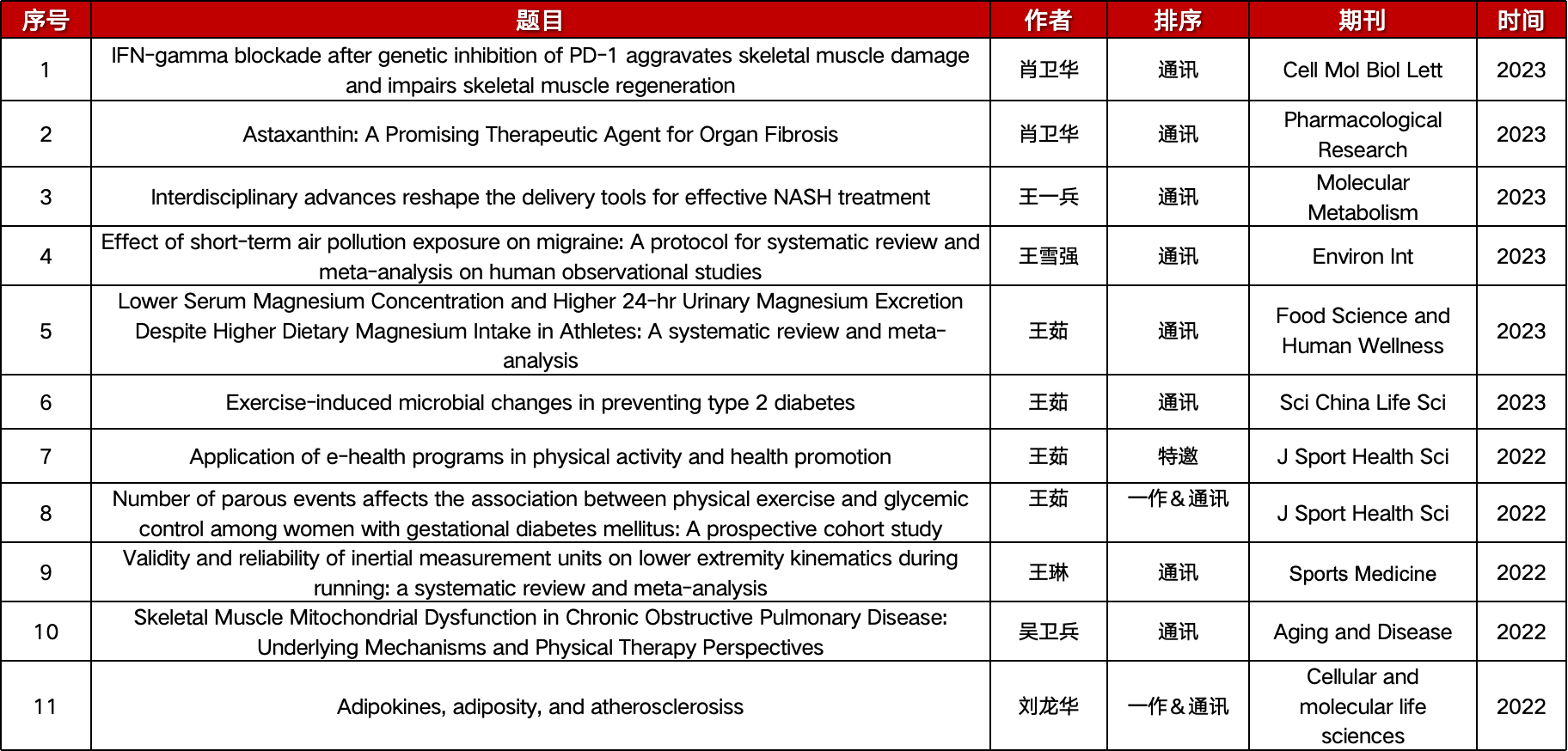 红足一1世足球网官方网站慢性病运动康复创新团队致力于培养青年人才,在团队带头人——运动健康学院院长王茹教授的带领下,以打造有理想信念、有文化底蕴、有科学精神、有创新意识的“四有”团队为目标,通过完善机制和搭建平台,建立了一支一流的青年人才队伍。团队现有成员25名,其中教授9名、副教授8名,获得各级各类人才称号12人次。团队成员们先后主持国家重点研发计划子课题、国家自然科学基金、省部级及厅局级课题 30 余项,原创成果发表多次发表在中科院1区,影响因子大于10分的期刊上(全国与运动防治代谢性疾病相关的原创文章共发表22篇,其中团队成员发文占22.7%)。2023年,全国14所体育院校中,共有20项国家自然科学基金获批,其中,本团队成员成功获得5项,占比25%。红足一1世足球网官方网站的慢性病运动康复创新团队的理论成果和科研工作,为运动健康领域注入了新的活力,推动了该领域的蓬勃发展,为建设健康中国作出了积极贡献。