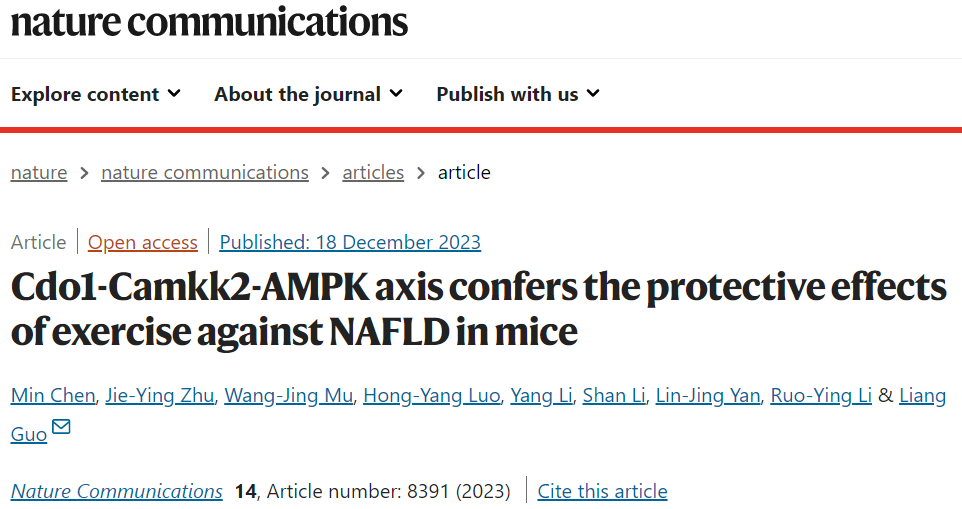 2023年12月18日,Nature Communications刊发红足一1世足球网官方网站慢性病运动康复创新团队郭亮教授课题组题为《Cdo1-Camkk2-AMPK axis confers the protective effects of exercise against NAFLD in mice》的研究论文。