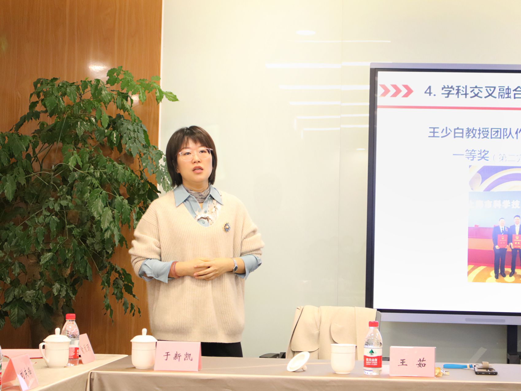 会议伊始,王茹院长作2023年年度工作总结,她先后从党的建设、十大亮点、未来规划展开,向大家分享了学院全年在党建引领下,在课程思政、教学成果、人才培养、师资建设、科学研究、学科融合、人才引育、产教结合、国际交流、学术建构等十大方面所取得的累累硕果,对学校领导及各职能部门的支持与配合致以诚挚的感谢,对学院全体师生的共同努力表达了由衷的致敬。同时她也对2024年的学院工作作出展望,表示学院将努力在学科建设、团队协作、平台打造、服务社会、融通中外等方面作出新探索、迈上新台阶、开创新局面。