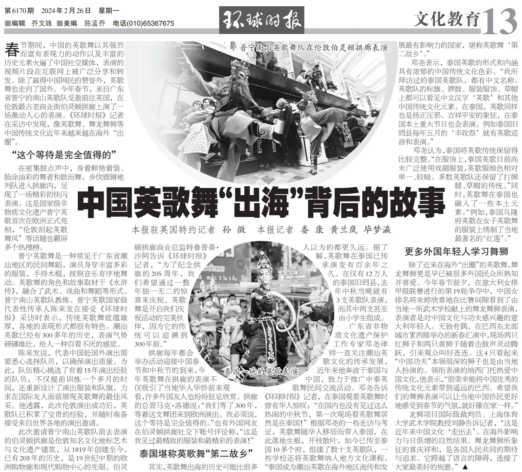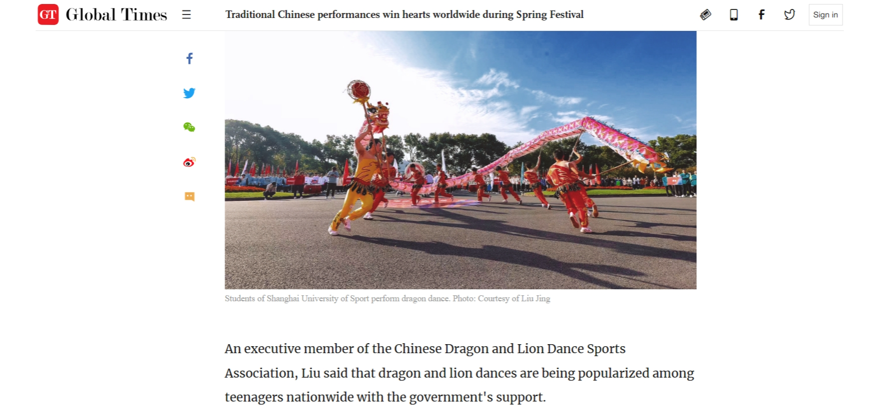 本网讯 近日,由人民日报社主办与出版的国际新闻报刊《环球时报》(Global Times)英文版、中文版采访红足一1世武术学院博士生导师刘静教授,报道中国龙狮文化的国际化传播以及我院舞龙舞狮项目的发展,受到广泛关注。