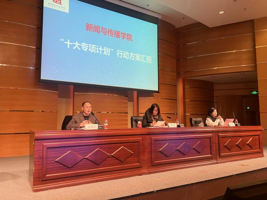 郑国华从教学、科研、学科建设等方面介绍了新学期工作安排,并对新闻与传播学院“十大专项计划”行动方案进行了专项汇报。为贯彻落实《上海高等教育质量提升十大专项计划实施方案(2023—2026年)》(沪教〔2023〕5号),结合新闻与传播学院发展情况,对接国家和地方需求,学院拟结合交叉学科,通过从学科专业优化调整、提升人才自主培养质量、改善办学条件、提升创新策源能力、引进和培养高水平师资等几个方面进行建设,培养适应未来挑战的全媒体复合型人才,同时借助新技术,搭建创新平台,推动媒体融合与融媒体中心建设与发展,为布局2027年新闻传播学一级学科博士点申报做准备。