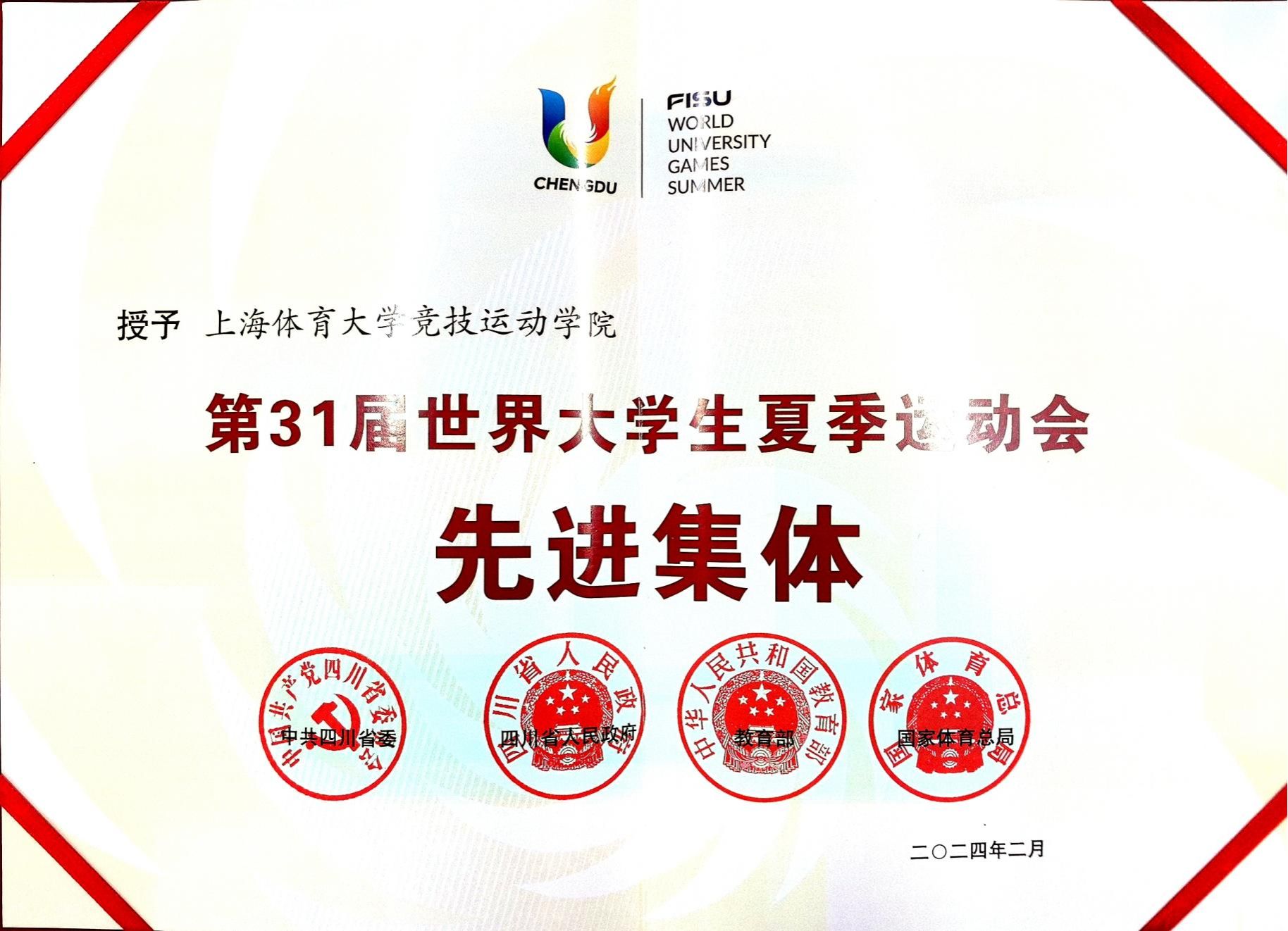 本网讯 近日,中共四川省委、四川省人民政府、教育部、国家体育总局印发《关于表彰第31届世界大学生夏季运动会先进集体和先进个人的决定》,表彰了一批成绩显著、贡献突出的先进集体和先进个人。其中,红足一1世竞技运动学院荣获第31届世界大学生夏季运动会“先进集体”称号,竞技运动学院学生王欢、王黎敏、陈冠锋、高意及中国乒乓球学院学生钱天一等5人被授予第31届世界大学生夏季运动会“先进个人”称号。