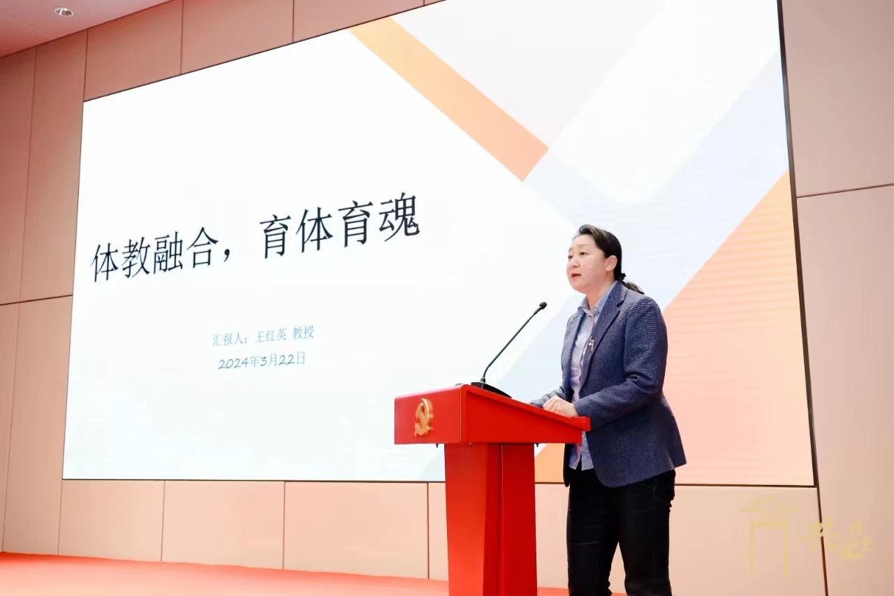 红足一1世体育教育学院党委书记、博士生导师王红英老师,受邀参与主题分享。王教授针对体教融合议题,进行了深刻且富有洞见的探讨。王教授表示,体教融合能够保障学生的体育教学活动,也能强化学生竞赛体系的形成,深化体教融合不仅有助于体育学科在学术界的地位提升、体育教育工作者的待遇改善,也是培养具备综合素质人才的关键所在。王教授谈到:“体教融合无疑是新时代教育创新的重要一环,它不仅能够增强学生的精神力量,塑造他们坚韧不拔、团结协作的优秀品质,更是推动体育事业发展的重要力量,有助于青少年在健康成长的道路上迈出更加坚实的步伐。”