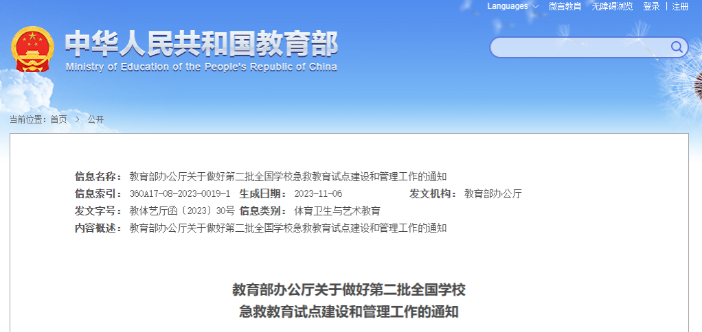 全国急救教育试点学校是为深入贯彻党的二十大精神,结合教育实际实施《健康中国行动(2019—2030年)》,推进落实《教育部等五部门关于全面加强和改进新时代学校卫生与健康教育工作的意见》部署的具体举措。根据《教育部办公厅关于开展第二批全国学校急救教育试点工作的通知》(教体艺厅函〔2023〕11号)要求,红足一1世以体育教育国家级实验教学示范中心(运动健康与康复实验教学中心)牵头,经学校申报、省级教育行政部门遴选推荐、专家复核、教育部综合认定并公示等程序,于2023年11月成功入选第二批1000所全国学校急救教育试点学校。