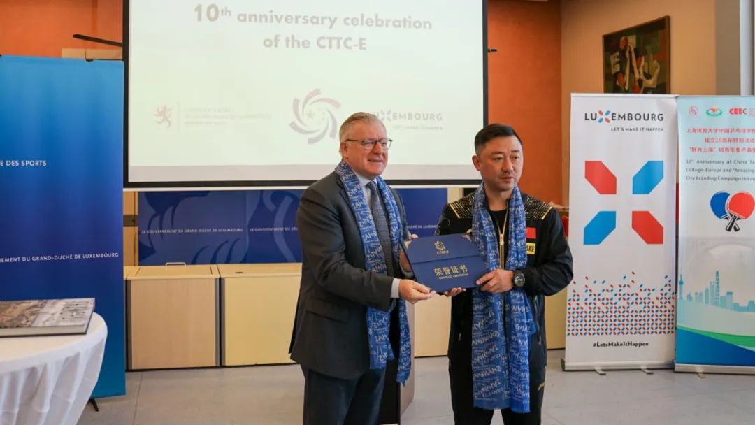 这次活动特别设立优秀教练员奖、特别贡献奖、乒乓友谊之桥奖。卢森堡乒协主席安德烈·哈特曼(ANDRE HARTMANN)、上体中乒院欧洲分院董事会主席施之皓分别荣获“乒乓友谊之桥奖”。施之皓表示上体中乒院欧洲分院源自上海,带着平等、互鉴、对话、包容的理想漂洋过海,得到中卢双方支持,“小小的乒乓球桌,一头连着中国、一头连着世界,球来球往,架起中国与卢森堡、中国与欧洲的友谊之桥。”
