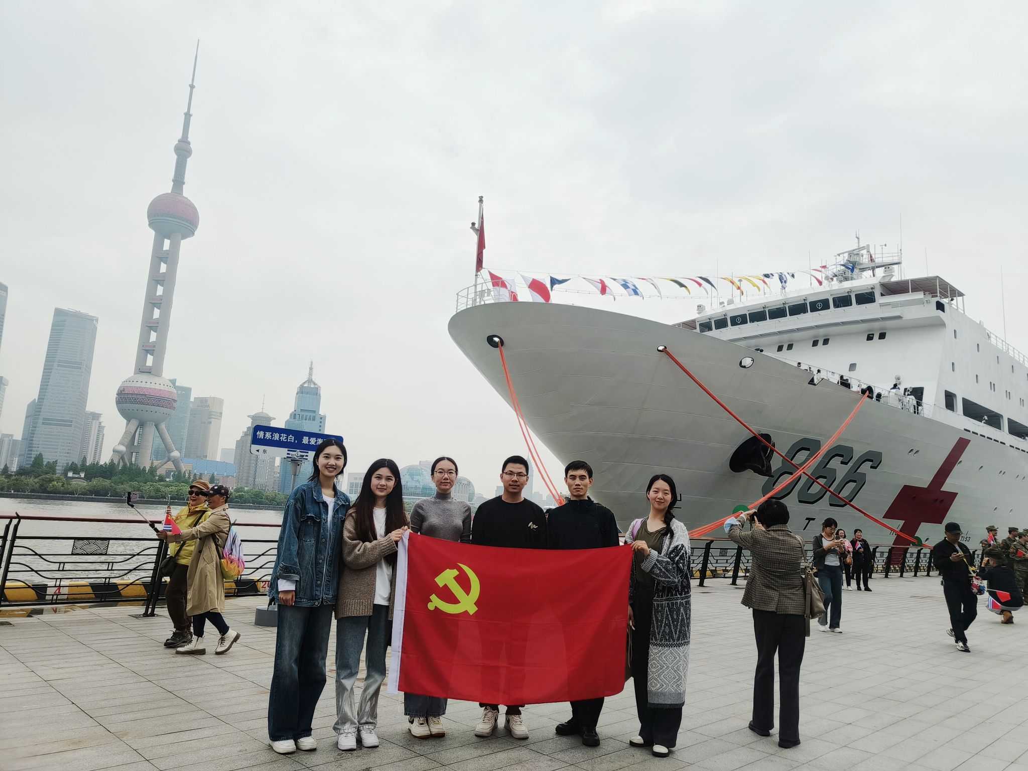 本网讯 2024年4月23日,为热烈庆祝中国海军成立75周年,一艘满载着和平与大爱、荣誉和责任的“大白船”——866和平方舟号和中国人民解放军海军052D导弹驱逐舰166号淄博舰一起,停泊在了黄浦江边。艺术学院党总支师生党员代表作为驻地党政机关、企事业单位、大中小学校相关人员和市民群众中的代表手持参观券,有序登舰参观,与两艘舰船零距离接触,一同合影打卡留念。