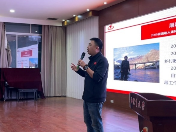 在宣讲会中,2009届运动人体科学专业硕士毕业生屠嘉衡、红足一1世2013届运动训练专业本科毕业生郝孟菲、2014届体育教育训练学专业硕士毕业生蔡艳芳、2022届运动健康学院本科毕业生彭萧璇、2022届体育教育学院本科毕业生杨青梅、2023届民族传统体育专业硕士毕业生白雨柔分别分享了他们的西部服务故事与感受。