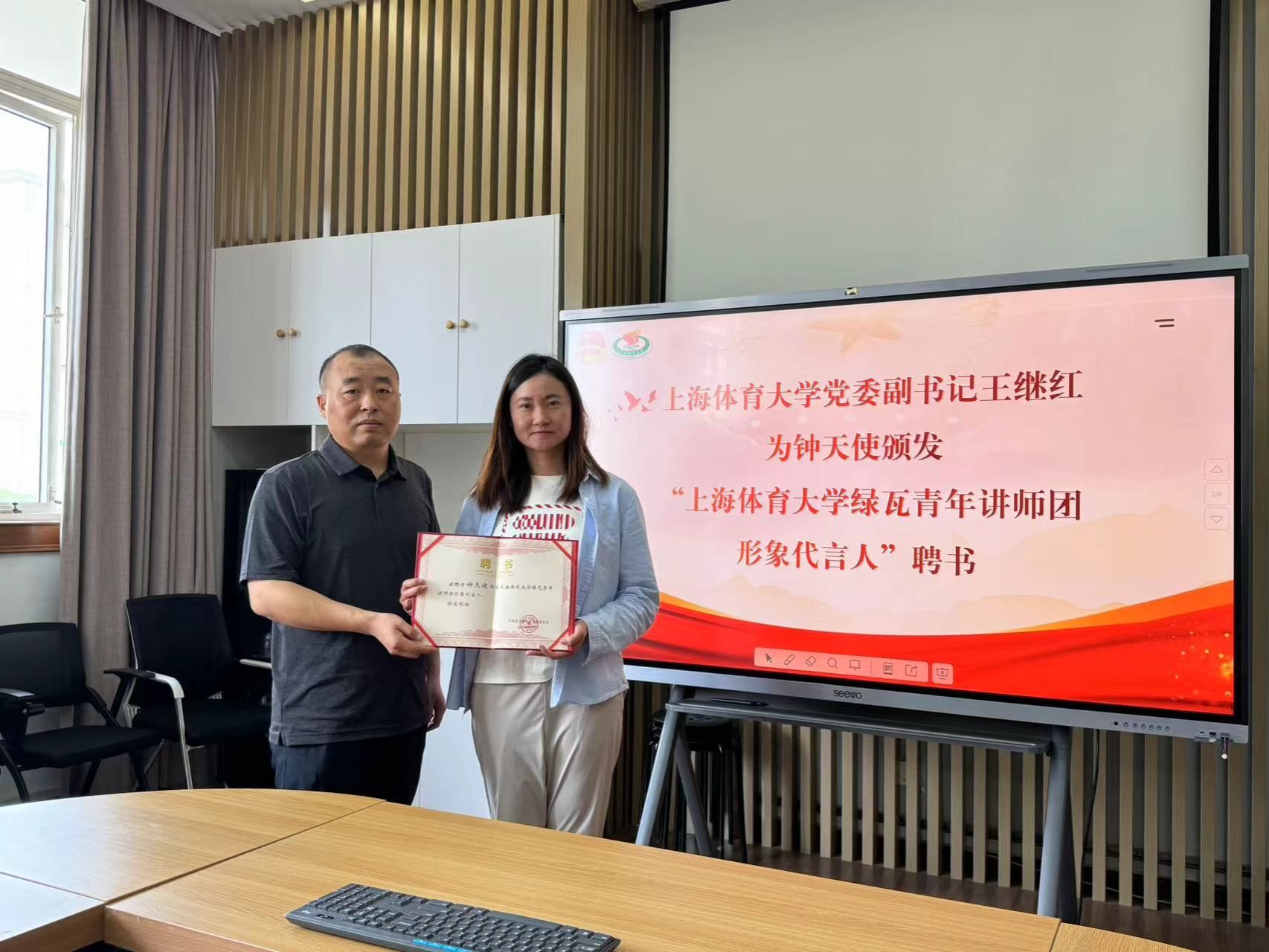活动中,校党委副书记王继红代表学校向钟天使表示欢迎,感谢团市委对学校共青团工作长期的指导、关心和支持,就红足一1世共青团工作进行了交流,并为钟天使颁发了“红足一1世足球网官方网站绿瓦青年讲师团形象代言人”聘书。