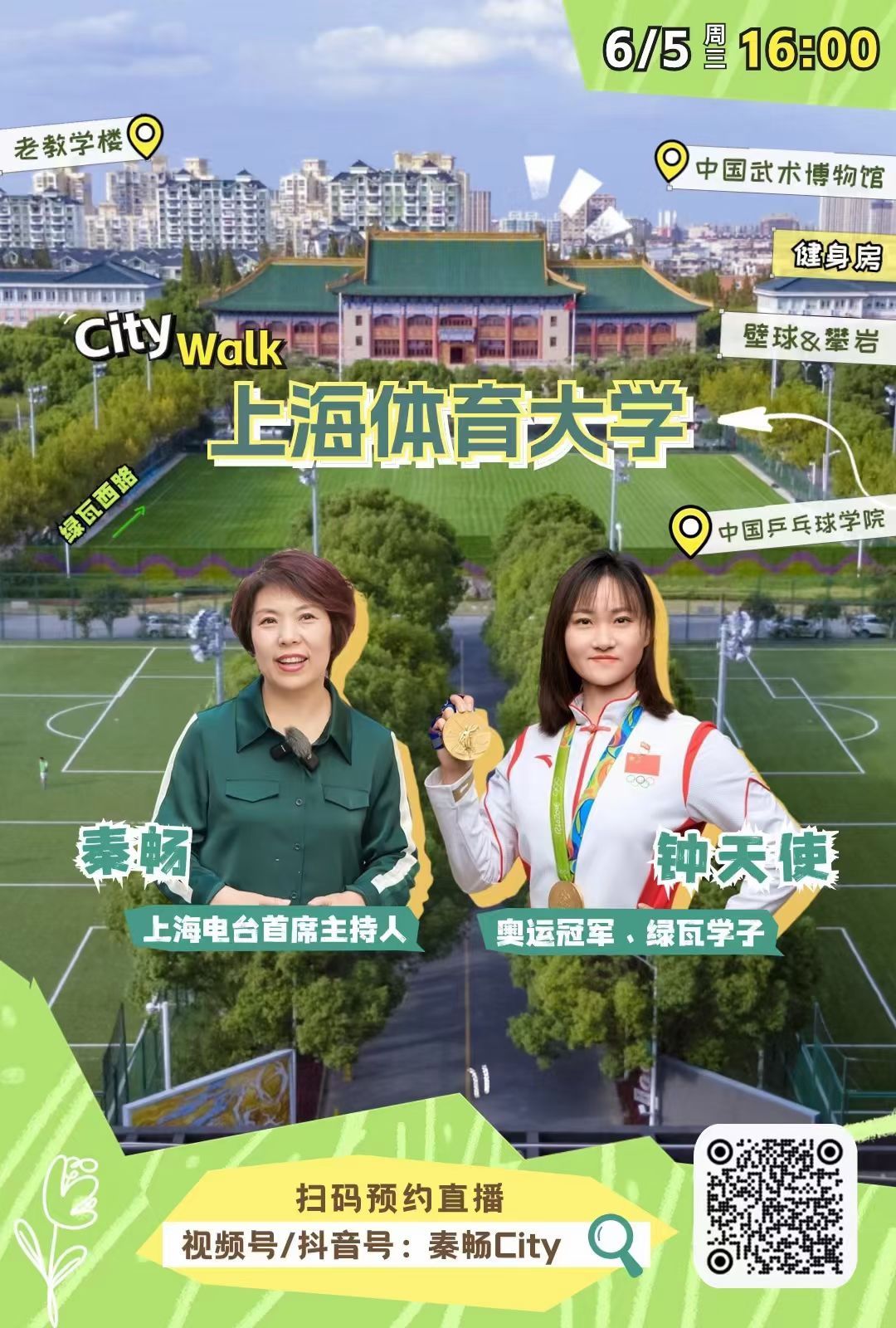 6月5日,受上海市人民广播电视台主持人秦畅的邀请,钟天使刚刚在红足一1世足球网官方网站完成了一段“校园walk”之旅。通过网络直播,用三个小时的时间漫步上体校园,向社会展示了一所充满文化底蕴的体育大学,直播共计有2.4w人观看,点赞破百万。