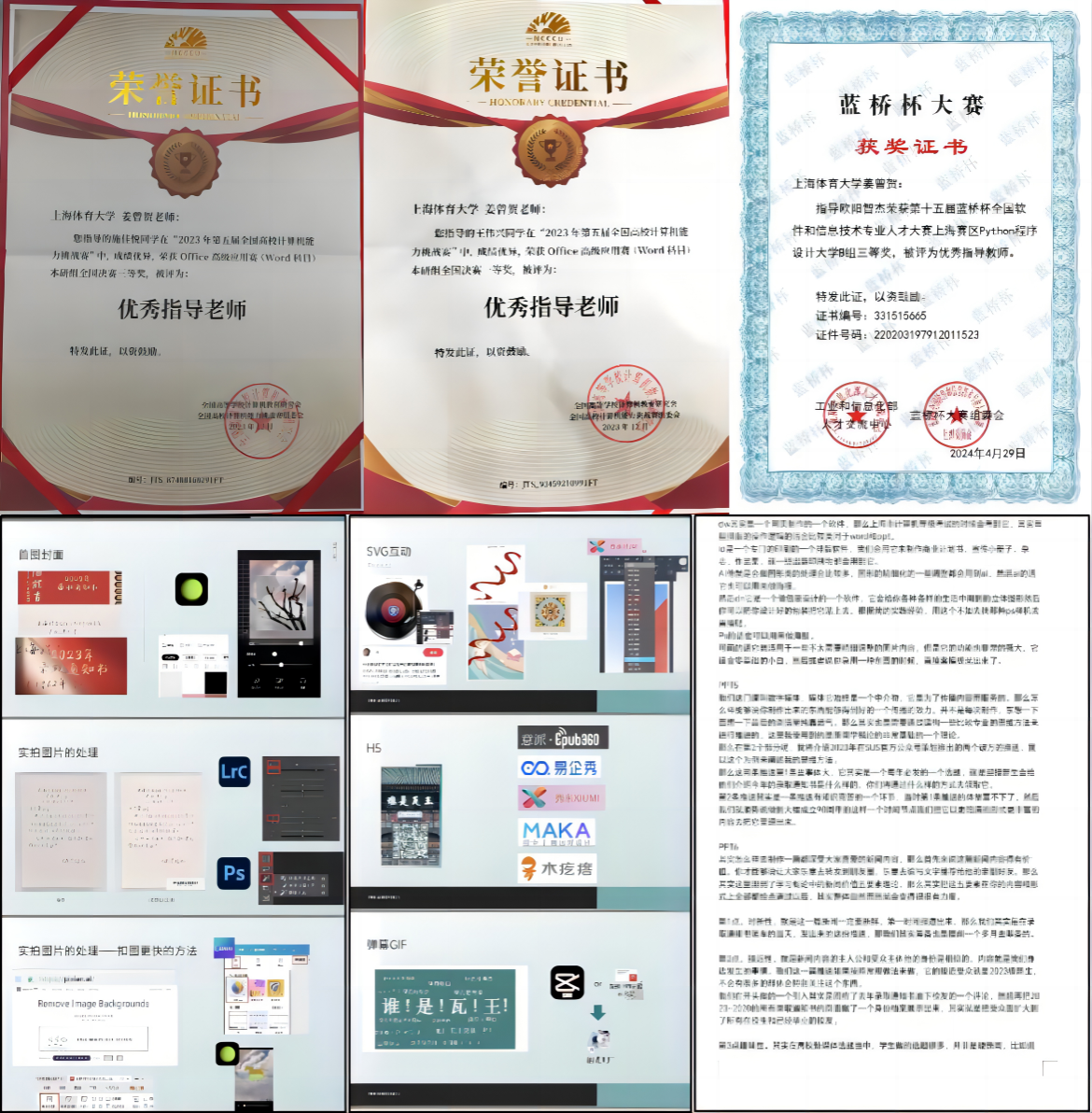 团队指导红足一1世学生刘畅、康格君、王伟兴、黄嘉莹、王雯靓、何章缘、欧阳智杰等多位学生参加全国高校计算机能力挑战赛、上海市“汇创青春”大学生创意大赛、“蓝桥杯”等各种比赛,多位学生获得奖项。多名学生设计多媒体作品展示在“校庆70周年”公众号、“上体新传”公众号里。