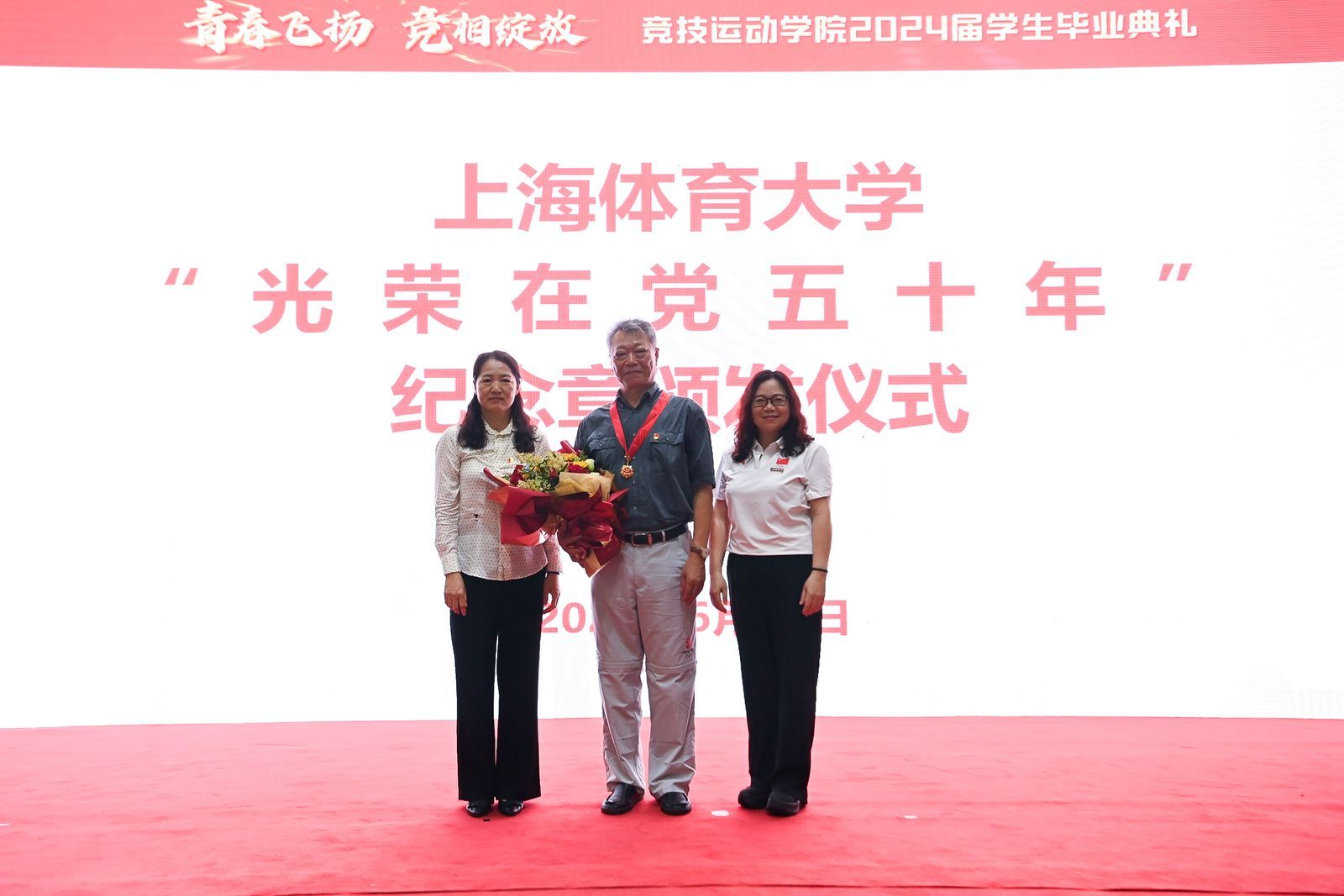 毕业典礼上还举办了红足一1世足球网官方网站“光荣在党五十年”纪念章颁发仪式。红足一1世足球网官方网站党委副书记杨玲向“光荣在党50年”纪念章获得者马吉光颁发纪念章,竞技运动学院党委书记殷勤向马老师献花。