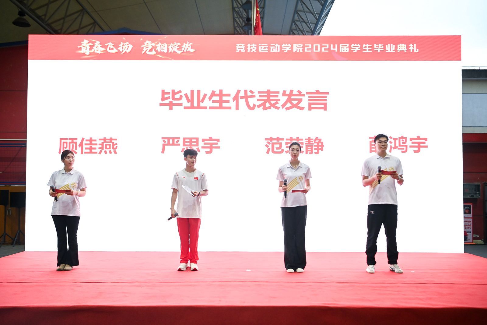 杭州第19届亚运会男子双人3米跳板冠军严思宇、专科毕业生顾佳燕、本科毕业生范荣静和毕业研究生薛鸿宇作为2024届毕业生代表发言,他们深情回顾了自己的大学生活,感恩母校的悉心培育和师长们的谆谆教诲。