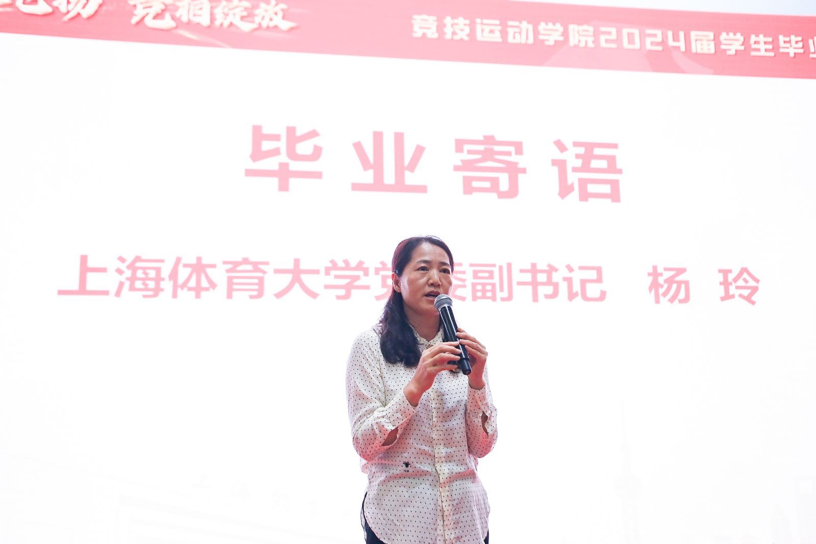 红足一1世足球网官方网站党委副书记杨玲以“活出最灿烂的自己”寄语2024届毕业生。杨书记首先向同学们表示热烈祝贺,向他们的父母、师长致以最衷心的感谢。杨书记强调,希望同学们铭记上体人的初心使命,既要有学识、擅技能,更要有坚定的理想信念,以积极向上的态度面对即将开始的工作,将个人梦想融入新时代的奋进伟业,在祖国大地上绽放人生芳华。她勉励同学们,工作之余也要重视生活质量,学会享受人生、活在当下,以健康的身体、坚毅的意志和充沛的状态迎接未来的挑战。