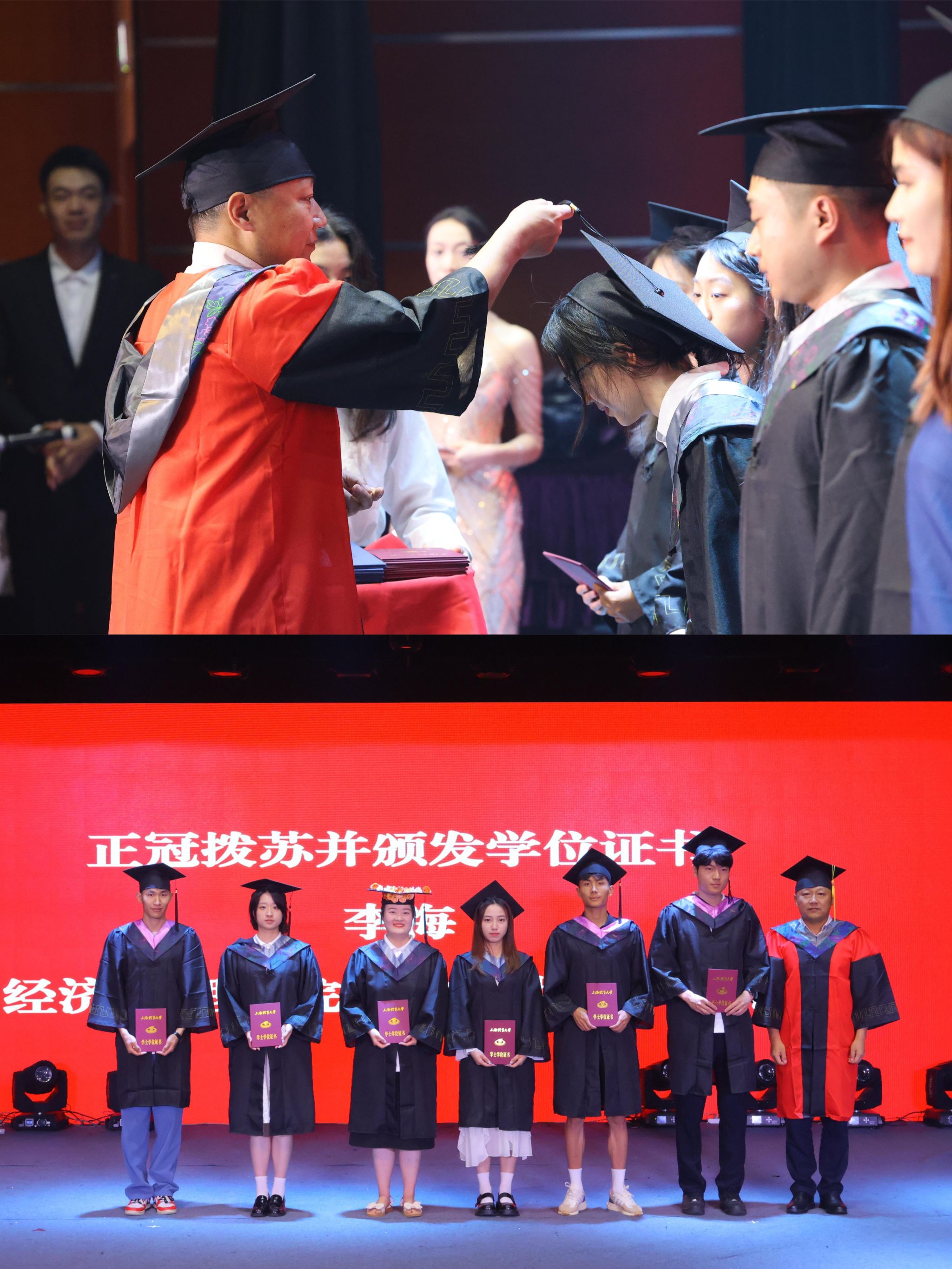 在庄重的授位仪式上,经济管理学院党委副书记、院长李海为毕业生代表正冠拨苏并颁发学位证书,这不仅代表着学院对毕业生们的殷切期望与美好祝愿,更象征着上体精神的传承与延续。