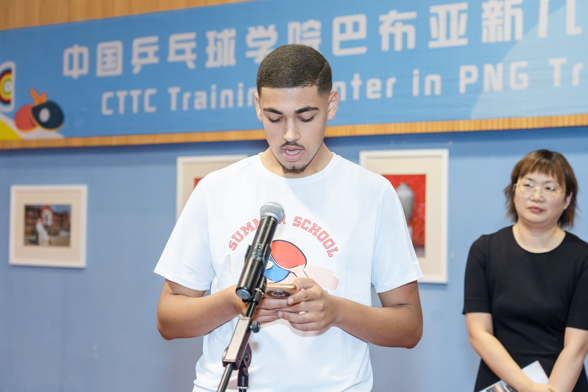 阿尔及利亚青少年运动员阿姆杰德作为2024年上海暑期学校(乒乓球项目)学员代表发言。他讲到,感谢中乒院的邀请,感谢中国驻阿尔及利亚阿大使馆和阿尔及利亚中资企业协会孙先生的帮助,让他来到了中国乒乓球学院参加这次暑期学校。他提到,有两位阿尔及利亚运动员曾于2016年来到这里参加国际乒联青少年挑战赛,当这两位运动员回国后便告知他们中乒院不仅各项设施一流、教练专业,还可以见到中国国家乒乓球队的球星。他表示,当他接到来自中乒院邀请的时候非常兴奋,希望能在世界上乒乓球最厉害的国家学到更多、变得更强,同时也想通过这次暑期学校认识来自世界各地的球友们,感受不同的文化和生活方式。
