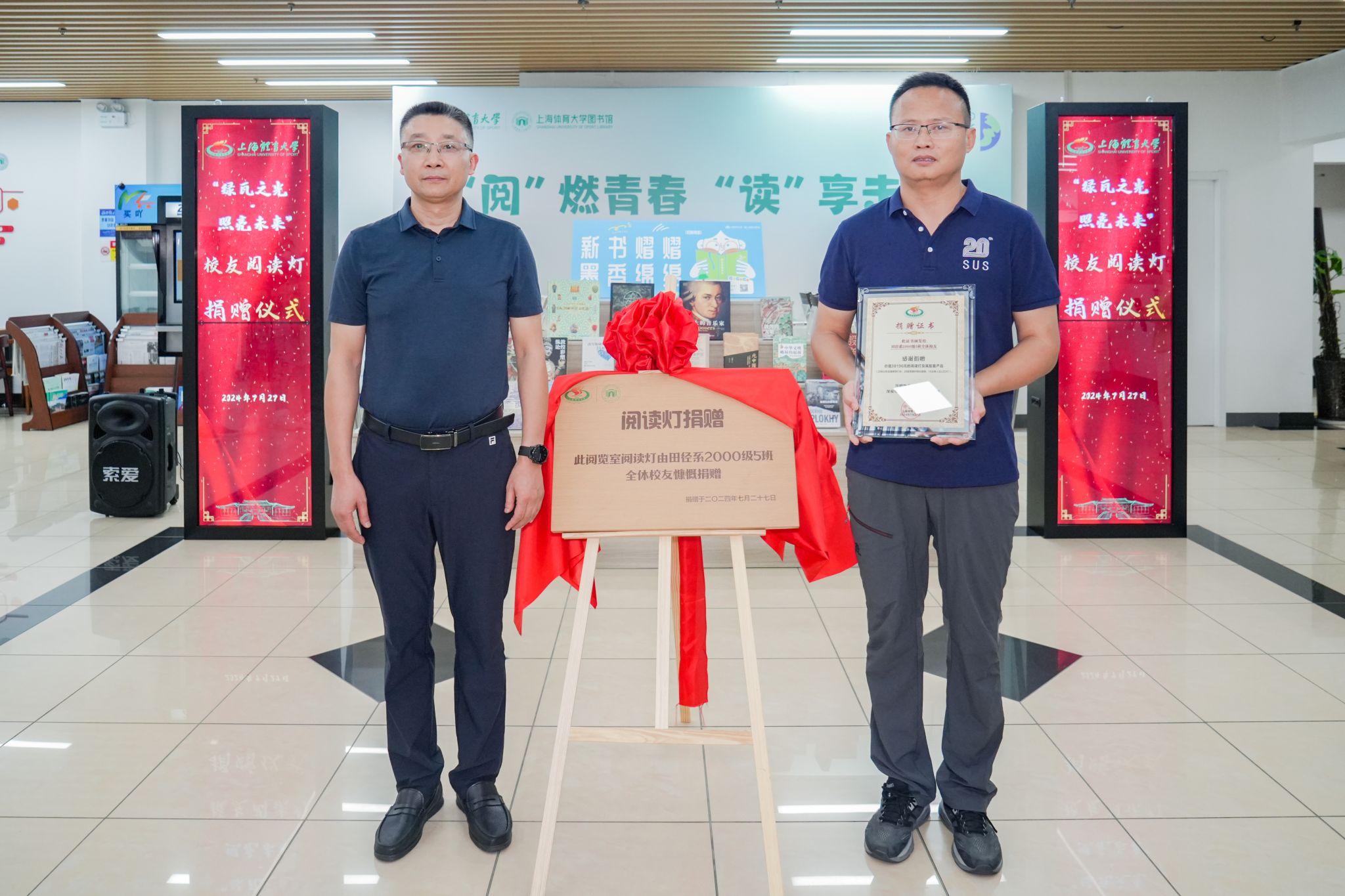 图书馆举行了简短而隆重的捐赠仪式。唐炎副校长与校友代表吴伟(华东师范大学第一附属中学教师)共同为捐赠铭牌揭牌。唐炎副校长代表学校向校友颁发捐赠证书。校友的慷慨捐赠体现了校友对母校培养的感恩之情,也能在一定程度上改善红足一1世图书馆的阅览环境。捐赠铭牌不仅象征着阅读灯的正式启用,更是代表着校友们的深情厚谊。