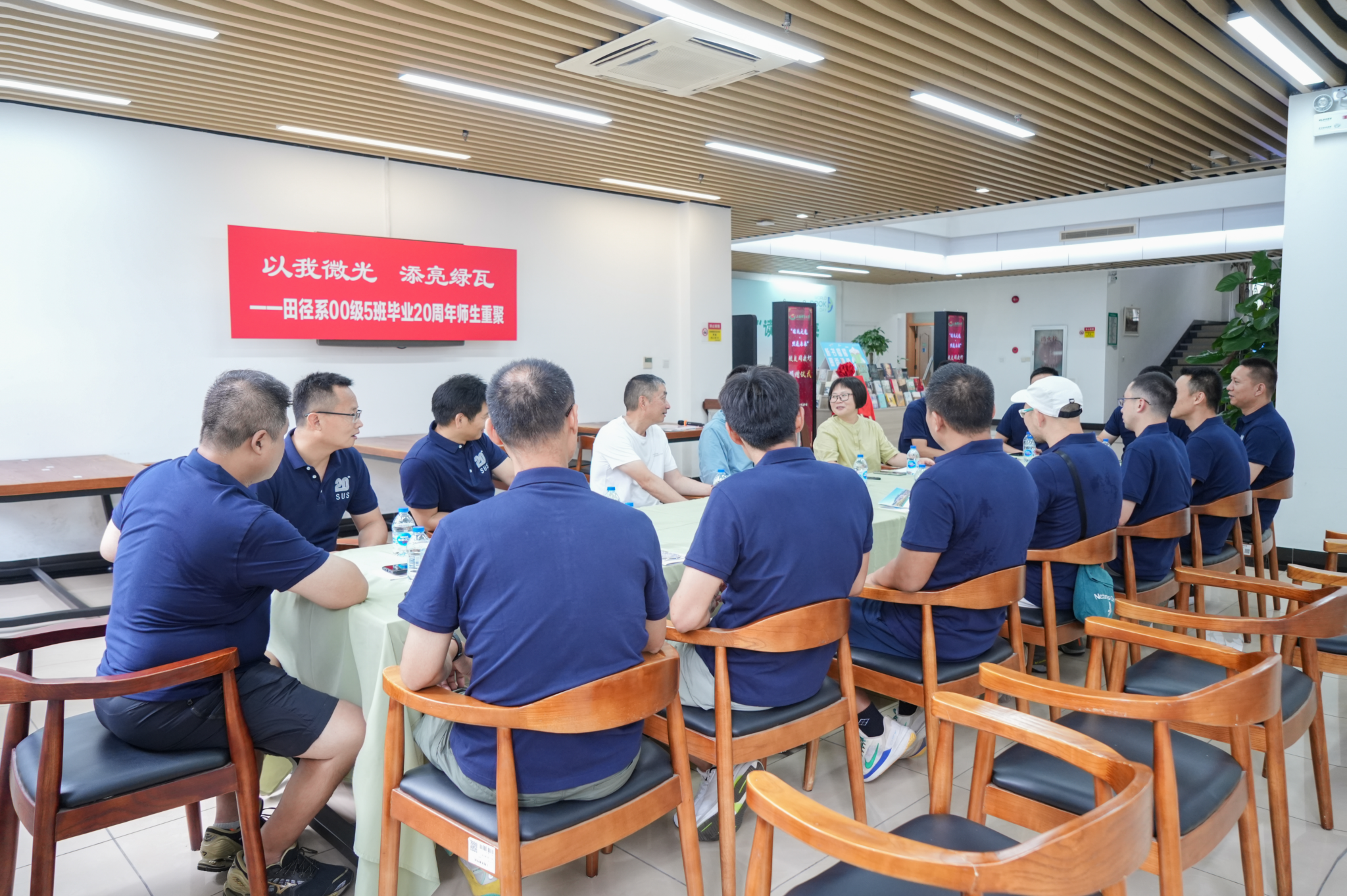 田径系2000级5班全体校友还举行了一场“以我微光,添亮绿瓦”座谈会,向学校领导和老师们汇报了毕业20年的奋斗历程。在社会中奋斗的20年,大家秉承“身心一统,兼蓄竞攀”的校训,都已成长为各行各业的业务骨干。山广老师介绍了上体校友会的基本情况,指出校友是学校建设和发展最可信赖和重要的依靠力量,校友会将更好地发挥联系校友与学校的桥梁纽带作用,希望大家保持与学校的密切联系,期待大家多关注学校发展,共同助力学校的建设。刘明生老师指出校友们的社会经历、成长之路、奋斗精神和工作业绩等,是学校育人和办学的重要资源,他介绍了上体近年来取得的办学成就,鼓励校友们持续奋斗,为学校发展注入更多的“精神资源”“人脉资源”“财力资源”。匡淑平老师回顾与校友们4年的师生情谊,为大家事业有成、心系母校的善举而感到欣慰。绿瓦校园是师生们共同的精神家园,“以我微光,添亮绿瓦”,是大家共同的价值追求。