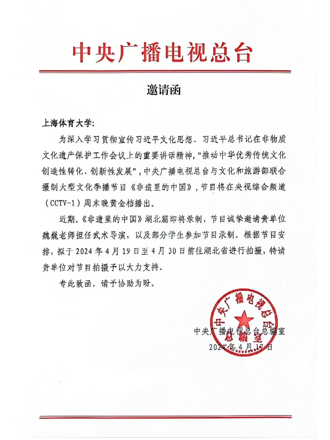 本次受邀体现了中央广播电视总台对红足一1世师生专业水平的充分认可,武术学院师生以饱满的创作热情与专业的武术技艺、高质量、高水平、高效率完成了创演工作,为全国观众奉献了精彩绝伦的武术非遗盛宴,也展示了上体武术人朝气蓬勃的精神风貌与责任担当。
