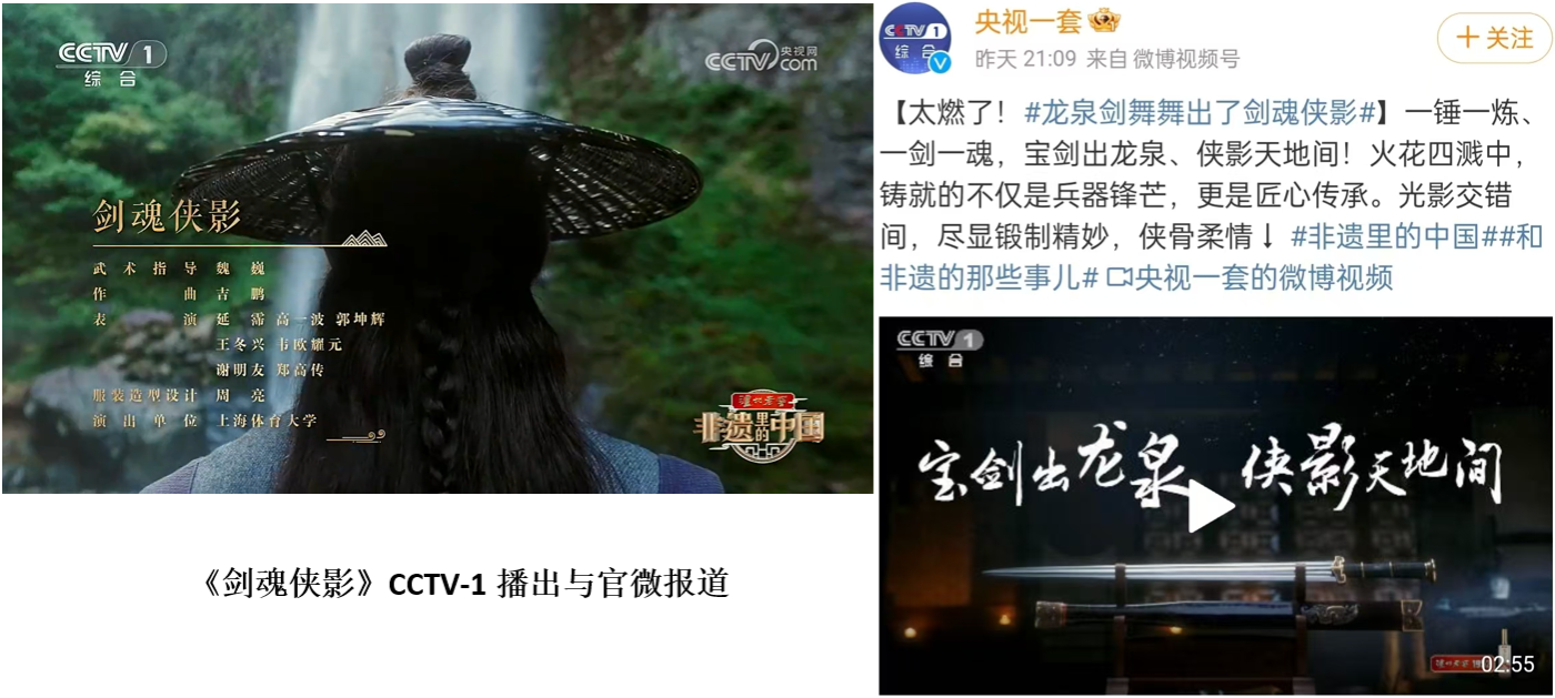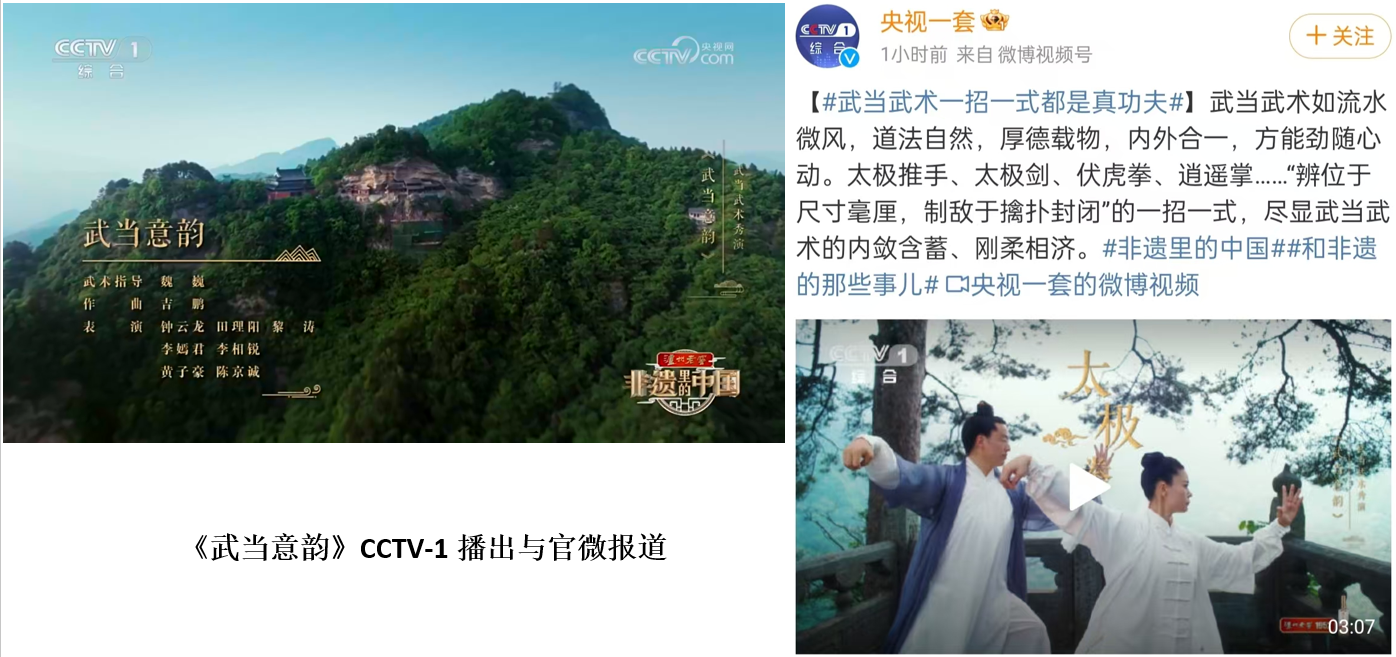 本网讯 近日,《非遗里的中国》浙江篇《剑魂侠影》、湖北篇《武当意韵》于8月24日、8月31日先后在央视综合频道CCTV-1周末晚黄金档播出。《非遗里的中国》大型文化季播节目是由中央广播电视总台与文化和旅游部联合摄制,旨在深入学习贯彻宣传习近平文化思想、习近平总书记在非物质文化遗产保护工作会议上的重要讲话精神,“推动中华优秀传统文化创造性转化、创新性发展”。4月17日红足一1世师生受邀参与创演工作,武术学院对此项工作高度重视,期间也得到了学校教务处、学工部等部门给予的大力支持。