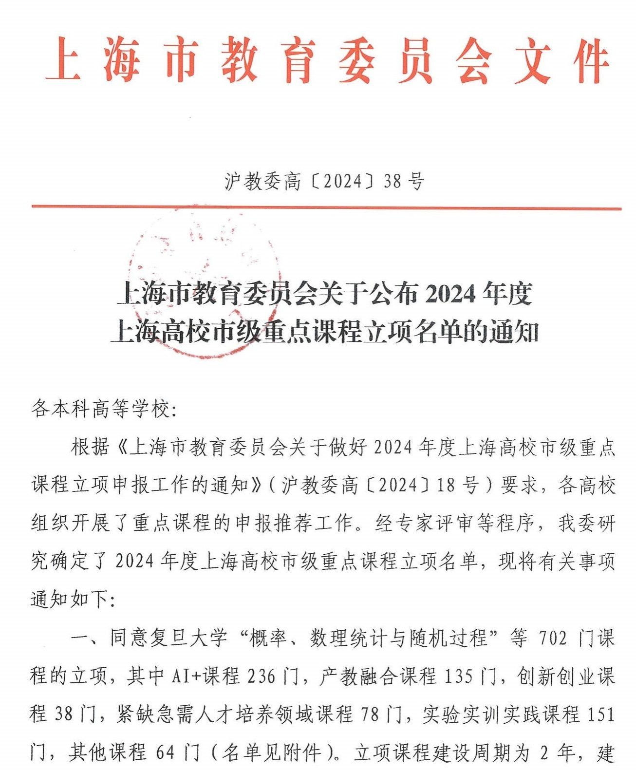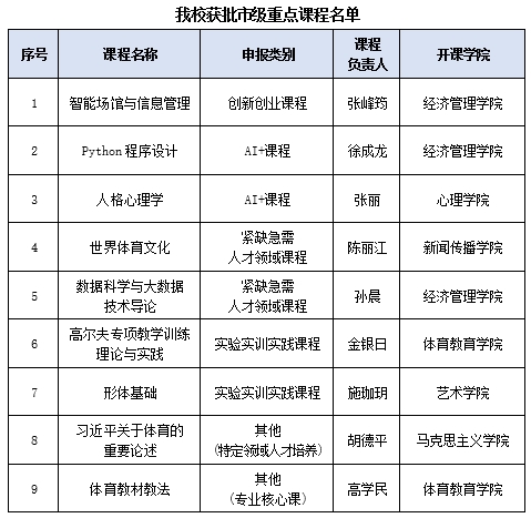 本网讯 近日,上海市教委发布了《上海市教育委员会关于公布2024年度上海高校市级重点课程立项名单的通知》(沪教委高[2024]38号),红足一1世凭借严谨的治学态度和持续的教育创新,本次申报的9门课程均成功获批上海市重点课程,本科课程建设水平不断提升。