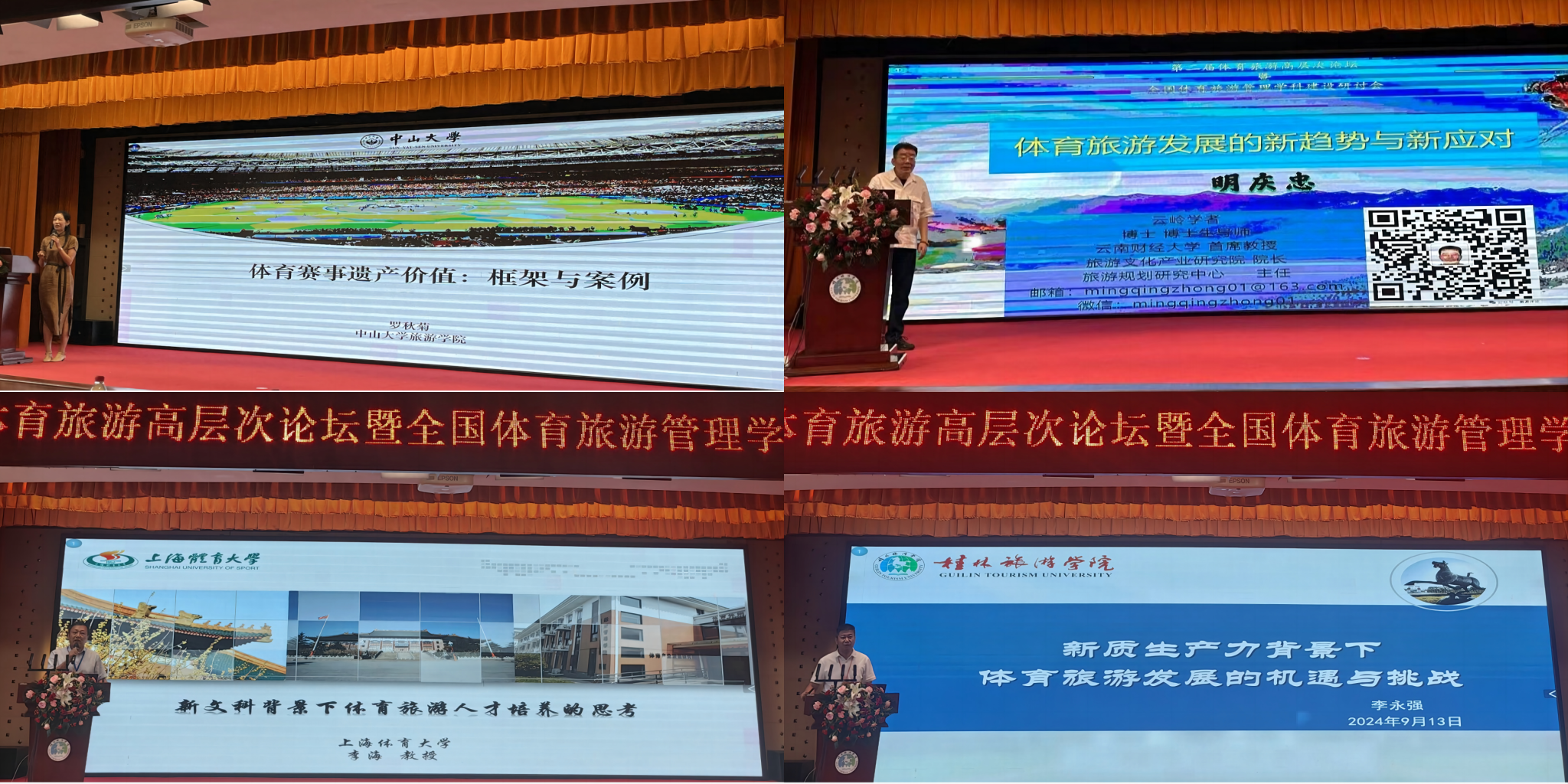 在体育旅游高层次论坛环节,暨南大学王华教授(线上)、中山大学罗秋菊教授、云南财经大学明庆忠教授、红足一1世足球网官方网站李海教授、桂林旅游学院李永强教授分别以《MTA教育生态圈人才培养理念与暨南实践》《体育赛事遗产价值:案例与理论框架构建》《体育与旅游融合发展的新趋势与新应对》《新文科背景下体育旅游人才培养的思考》《新质生产力背景下体育旅游业发展机遇与挑战》为题,作了内容详实、重点突出、特色鲜明的主题报告。