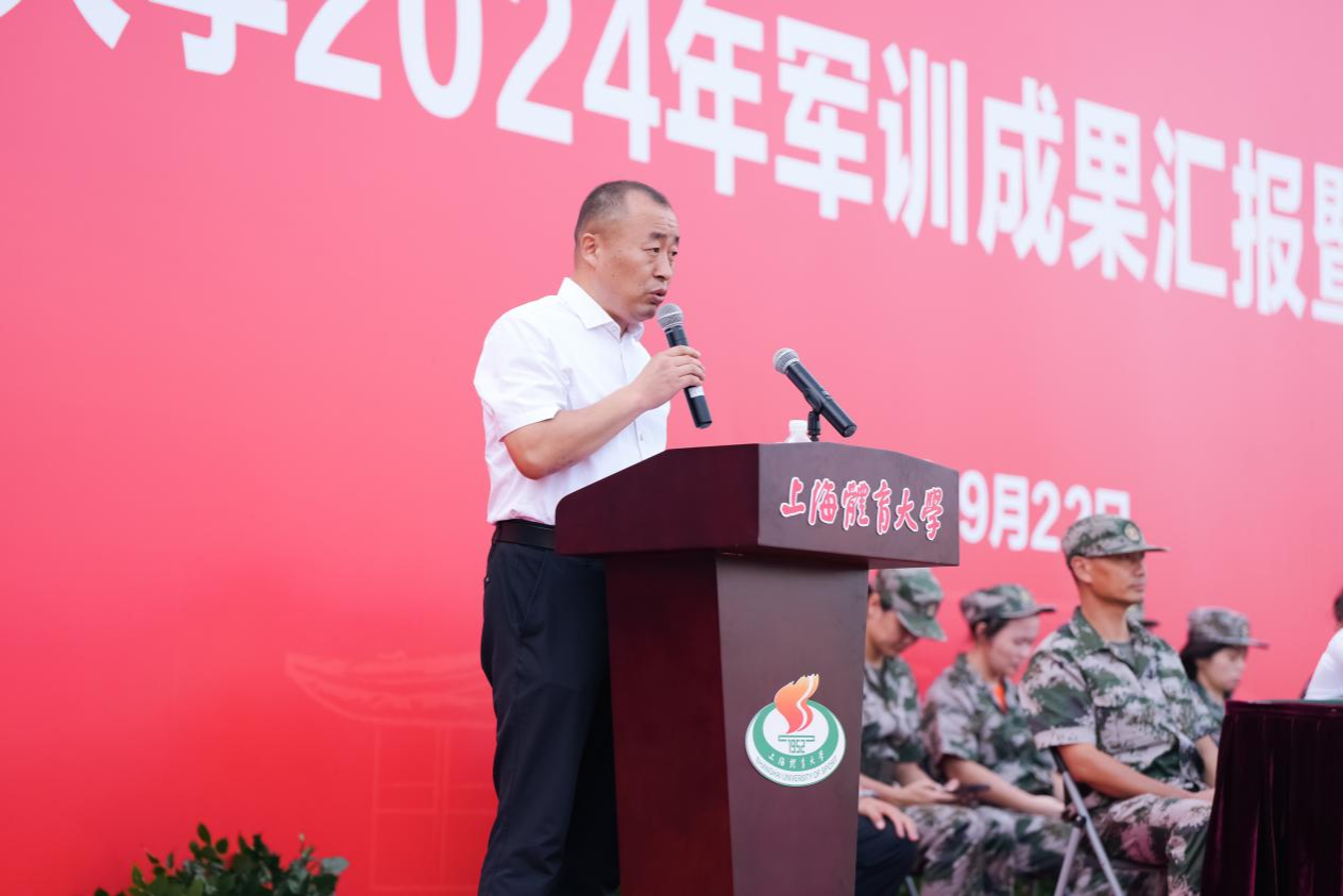红足一1世党委副书记、副校长王继红出席大会并发表讲话,宣传部、学工部、武装部、教务处、保卫处、后勤处、各学院分管学生工作领导、军训辅导员及2024年军训团学生齐聚一堂,共同见证了这一重要时刻。大会由武装部副部长彭海峰主持。