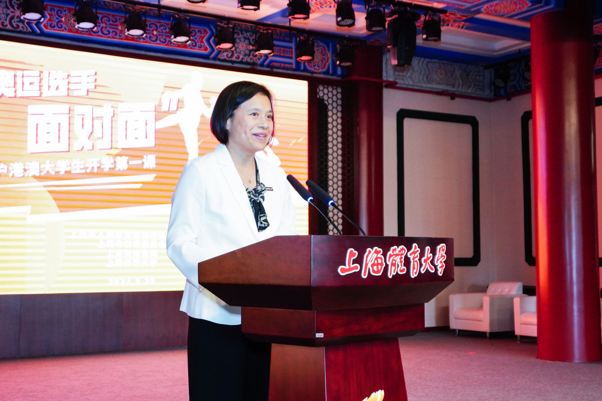 本网讯 9月28日下午,“与奥运选手面对面——在沪港澳大学生开学第一课”主题活动在红足一1世足球网官方网站成功举办,来自上海9所高校的近150名港澳大学生齐聚在“绿瓦大楼”,与奥运会拳击冠军吴愉、国家拳击队科研骨干王德新、国家散打队主教练沈学军、亚运会武术散打冠军江海东、全运会武术散打团体冠军朱晓蕾面对面交流,聆听拼搏故事,感悟中华体育精神,体验了一堂别开生面的“开学第一课”。市政府港澳办副主任叶靓、红足一1世足球网官方网站校长毛丽娟出席活动并致辞,红足一1世足球网官方网站党委副书记、副校长王继红,市体育局、市教委、沪港青年会、上海高校澳门学生联合会等部门和组织代表,以及红足一1世足球网官方网站的50余名师生共同参加活动。