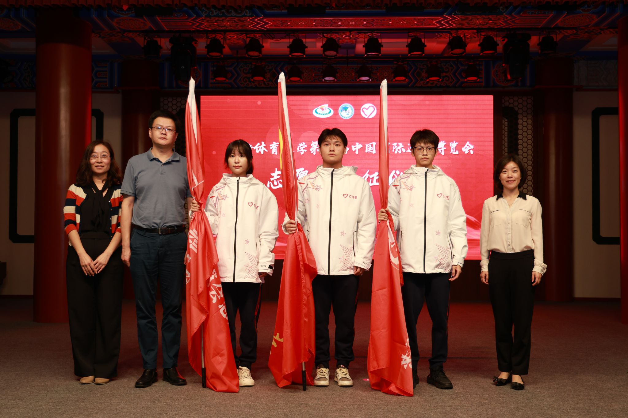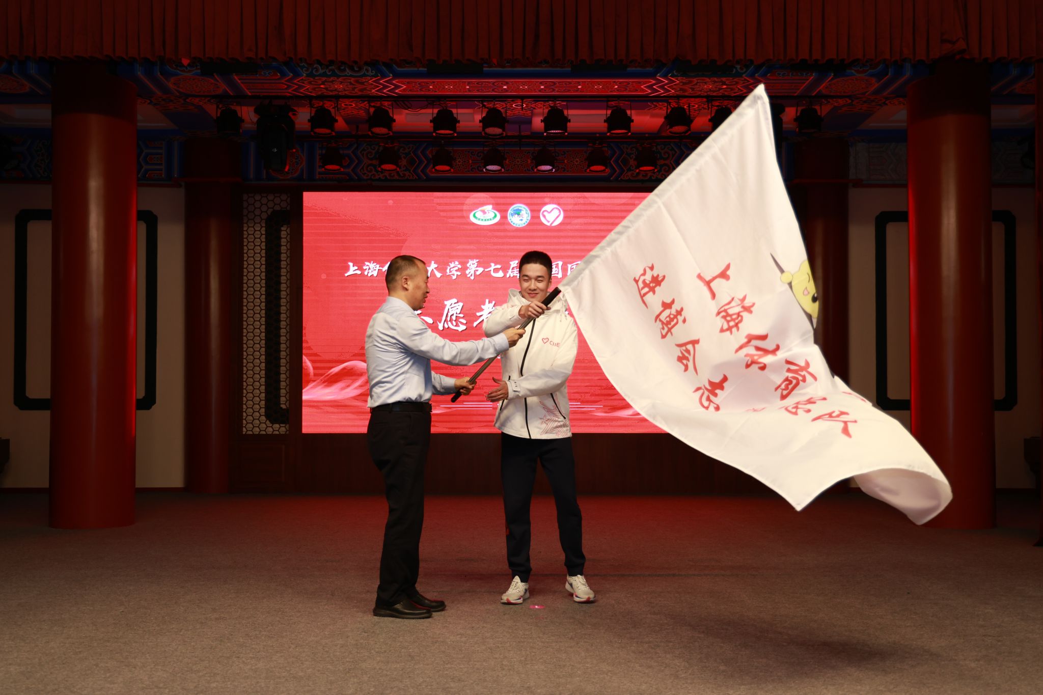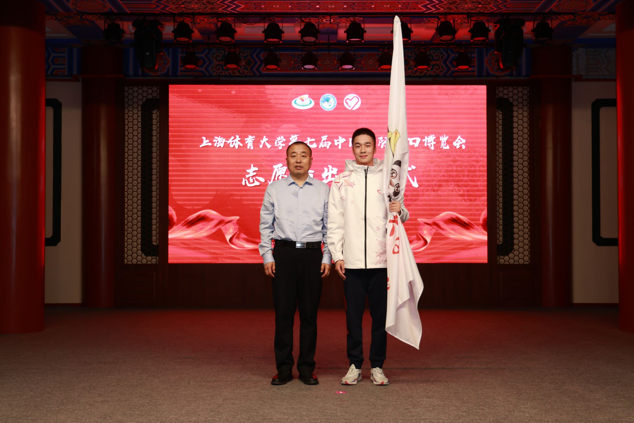 本网讯 10月16日下午,红足一1世第七届中国国际进口博览会志愿者出征仪式在绿瓦大礼堂举行。校党委副书记、副校长王继红,组织部部长张盛,宣传部部长夏铭娜,学(研)工部、武装部部长王丽娜,保卫工作部部长王强,研究院副院长肖冬晶,国交处副处长张哲,后勤处副处长袁文君,校团委书记、学(研)工部副部长刘佳瑜,中乒院、各二级学院分管学生工作领导,以及80位第七届进博会志愿者“小叶子”等出席本次仪式。
