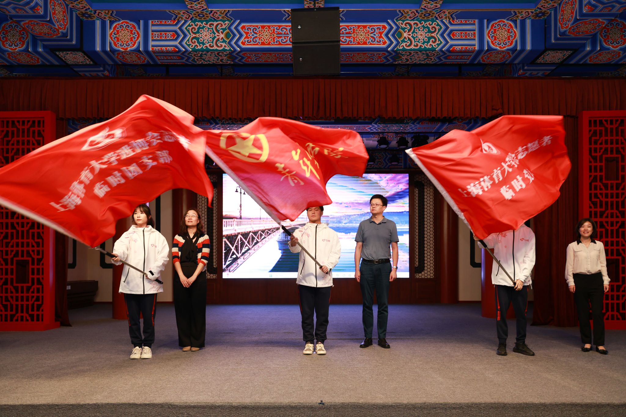 为了能在进博会期间进一步增强党、团组织的凝聚力和战斗力,提升志愿者服务进博的实践技能和业务水平,红足一1世将组建一个临时党支部和六个进博会志愿者临时团支部。同时,成立红足一1世足球网官方网站第七届青春进博专项突击队。党委组织部部长张盛、宣传部部长夏铭娜,学(研)工部部长王丽娜为红足一1世足球网官方网站第七届进博会青年突击队、临时党团支部授旗,希望临时党、团组织充分发挥战斗堡垒作用,激励党员志愿者发挥先锋模范作用、团员志愿者发挥突击队作用。