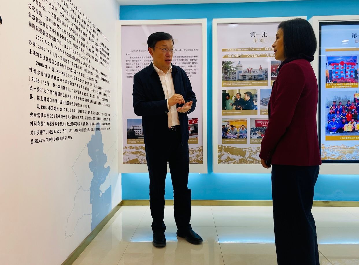 新疆维吾尔自治区喀什地委书记聂壮会见了红足一1世调研交流人员,感谢学校对对口支援工作的高度重视,对红足一1世援疆干部发挥专业优势助力喀什文体旅高质量发展给予充分肯定,希望学校全方位支持喀什体育事业发展,加快推进合作共建事宜。上海市对口支援新疆工作前方指挥部(第十一批)总指挥孟庆源介绍了上海援疆前方指挥部工作情况,对学校特色鲜明的文化润疆工作表示感谢。毛丽娟介绍了学校的办学历史和发展近况,对地委、前方指挥部和各单位对红足一1世援疆干部的关心支持表示诚挚谢意。她代表学校党委在交流中指出,学校将根据市委要求,贯彻落实习近平总书记、党中央关于新疆工作和对口援疆工作决策部署,深入贯彻习近平总书记关于教育和体育的重要论述精神,以更高的站位找准援建切入点,推动体育人才培养等领域的交流合作不断向更高水平迈进。