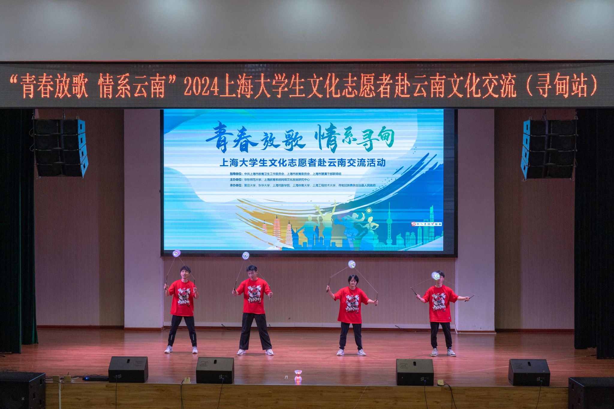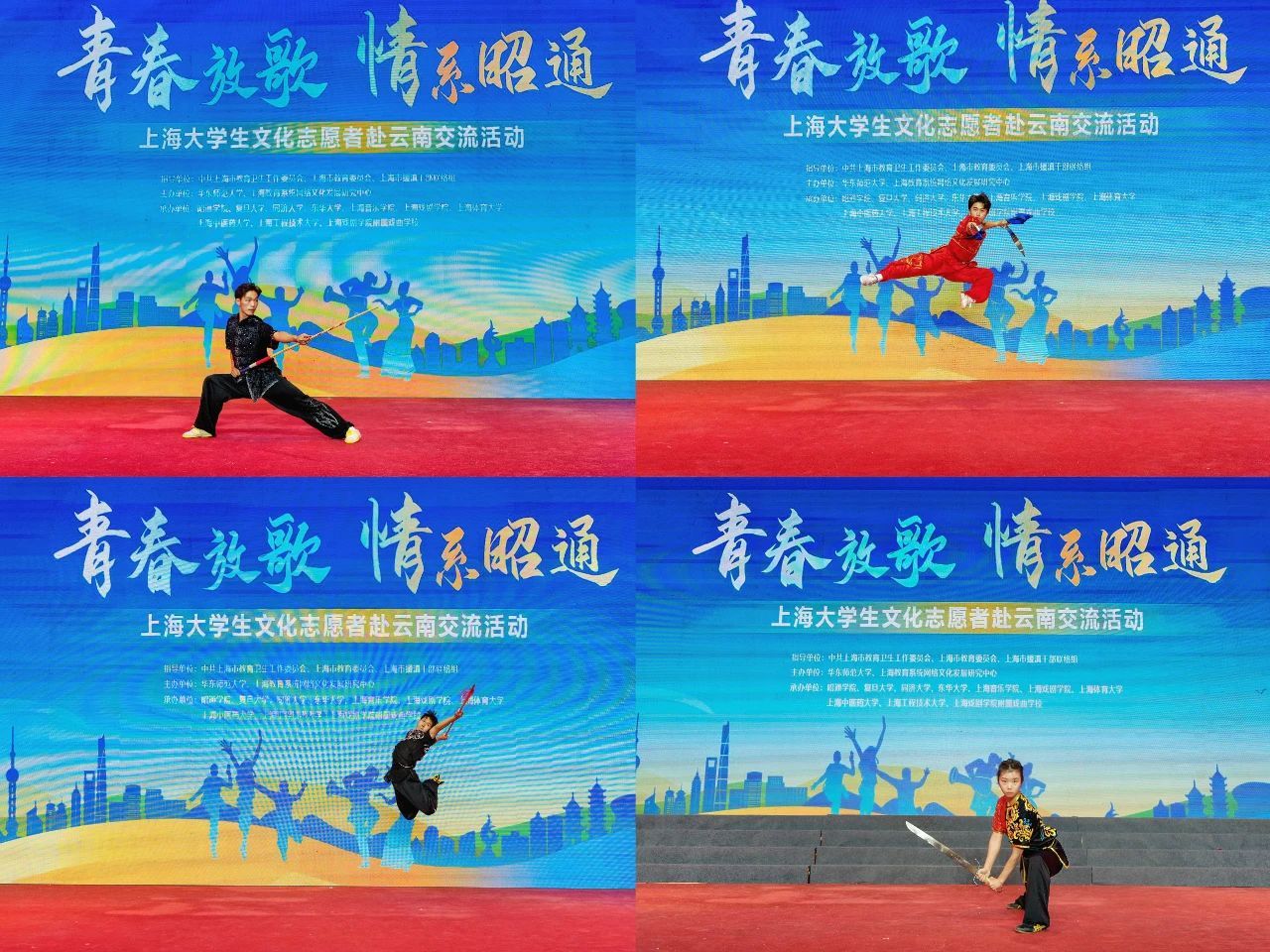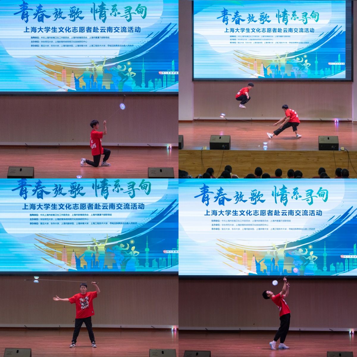 此次交流巡演分为昭通站和寻甸站,红足一1世足球网官方网站分别带来了《群英荟萃》武术表演和《龙腾盛世》炫技空竹表演,来自同济大学、华东师范大学、东华大学、上海音乐学院、上海戏剧学院、上海中医药大学、上海工程技术大学等学校的学生,还带来了舞蹈、时装秀、音乐话剧、川剧变脸、大合唱等文艺节目,昭通学院和寻甸二中选送了舞蹈类、合唱类节目进行表演。