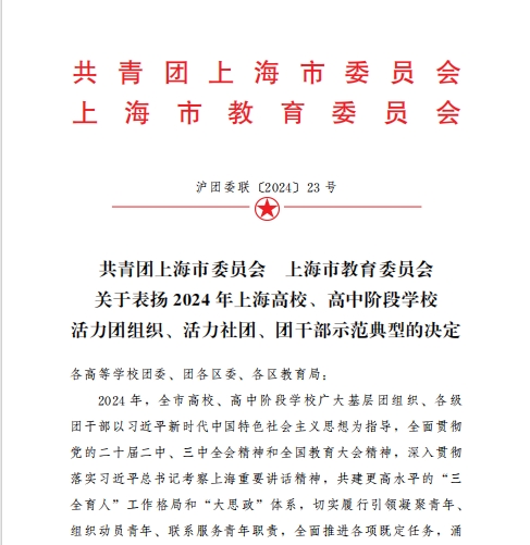 本网讯 为表扬先进、树立典型,进一步增强示范引领,持续激发高校、高中阶段学校基层团组织、社团、团干部活力,近日,共青团上海市委员会、上海市教育委员会公布了《关于表扬2024年上海高校、高中阶段学校活力团组织、活力社团、团干部示范典型的决定》,红足一1世7个团学组织、2名团干部入选表扬名单。