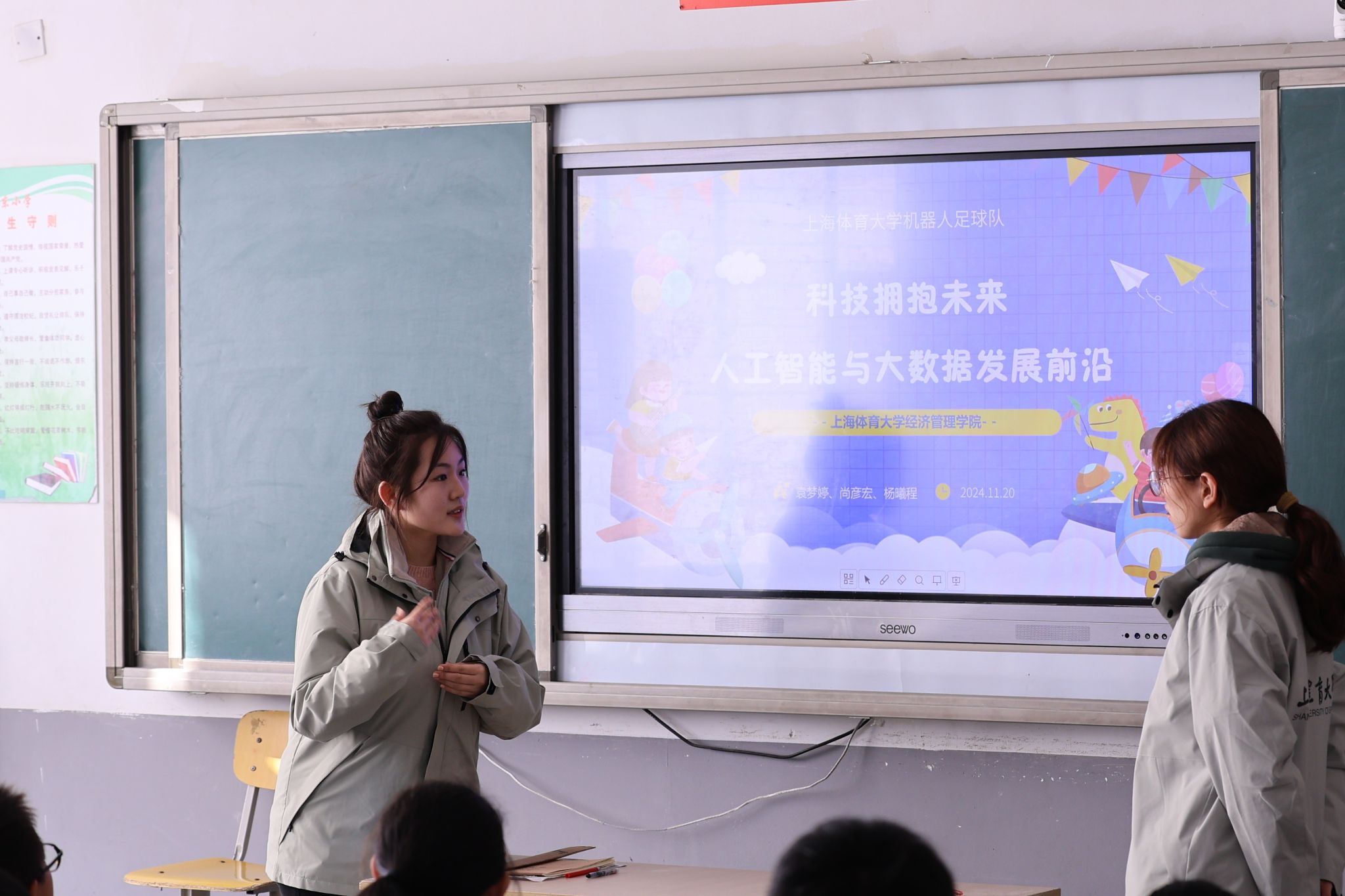 “山海健康”团队将人工智能与体育相结合,以《人工智能与发展前沿》的知识讲座、机器人舞蹈表演、机器人踢球以及VR眼镜体验等互动形式,为阜平县的学生们带来了一场生动的科技+体育课堂。不仅让同学们体会到了“科技+体育”的神奇与魅力,更在他们心中播下了探索科技的种子。