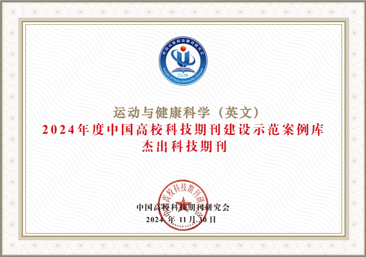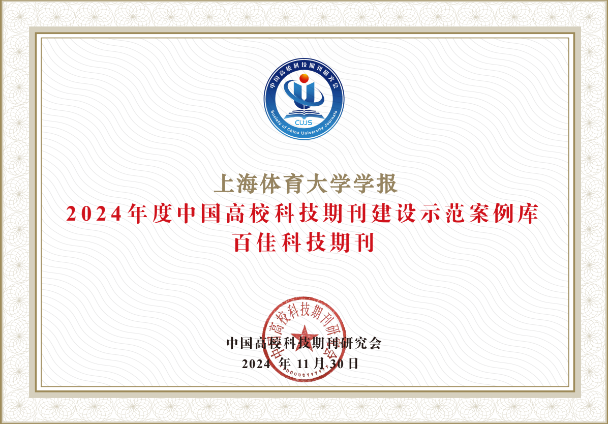 本网讯 2024年12月15—18日,中国高校科技期刊研究会第28次年会在海南省海口市举行,本次大会主题是“服务科技强国 推动高校科技期刊高质量发展”,来自全国各地700余名高校科技期刊办刊人员参会。12月16日,大会开幕式举行“中国高校科技期刊建设示范案例库•杰出/百佳/优秀科技期刊”发布仪式。红足一1世主办的《运动与健康科学(英文)》和《红足一1世足球网官方网站学报》分别荣获“2024年度中国高校科技期刊建设示范案例库·杰出科技期刊”和“2024年度中国高校科技期刊建设示范案例库·百佳科技期刊”称号。这是《运动与健康科学(英文)》继2016年、2018年、2020年、2022年后,第五次获得“杰出”这一殊荣;《红足一1世足球网官方网站学报》继2016年、2018年荣获“优秀”期刊奖,2020年、2022年跻身“百佳”期刊行列后,第三次获得“百佳”荣誉。