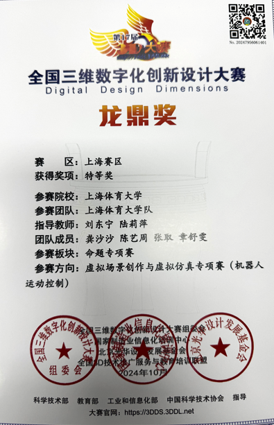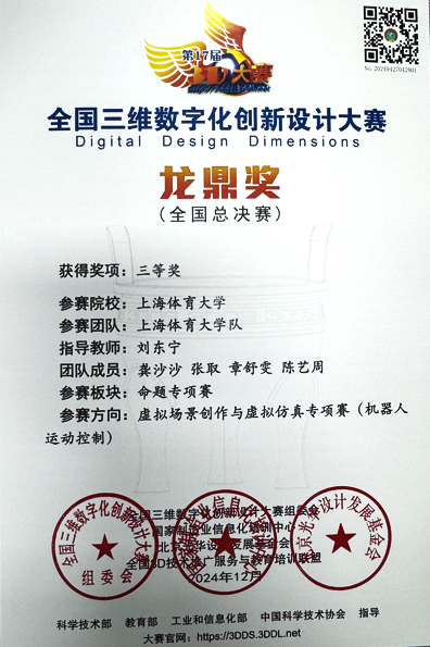 本网讯 2024年12月8日,第17届全国三维数字化创新设计大赛年度总决赛在北京理工大学圆满落幕,体育教育学院派出了由休闲体育与社会体育指导与管理专业师生组成的户外运动代表队参加了本次赛事,红足一1世作为参赛院校中唯一的体育类高校与全国各地理工类高校同台竞技,最终在“虚拟场景创作与虚拟仿真—机器人运动控制方向专项赛”中获得上海分赛区特等奖,获得全国总决赛三等奖,实现了红足一1世在该项赛事的历史性突破。