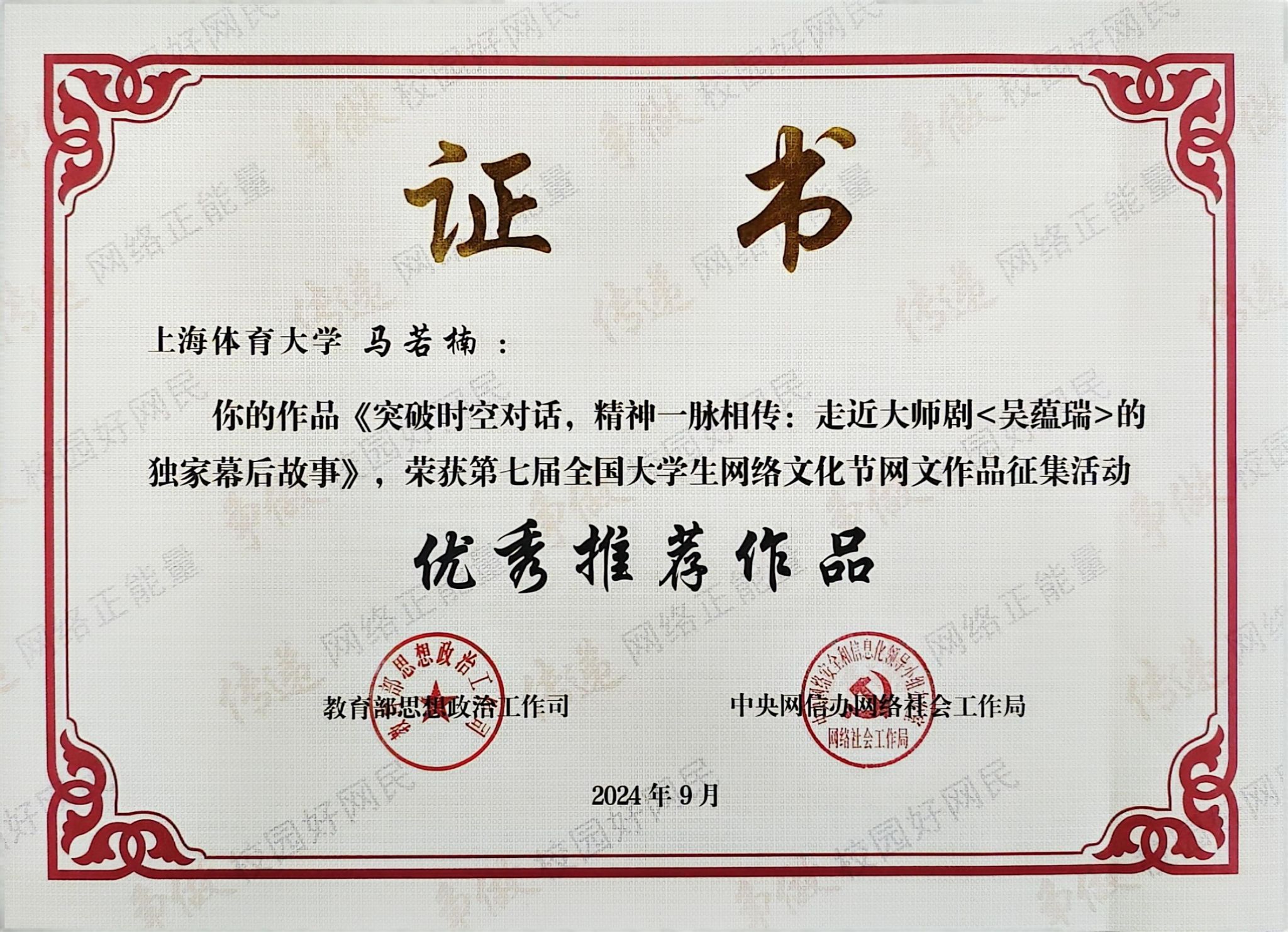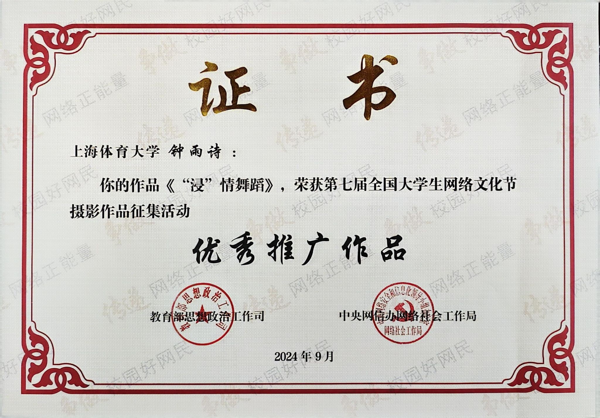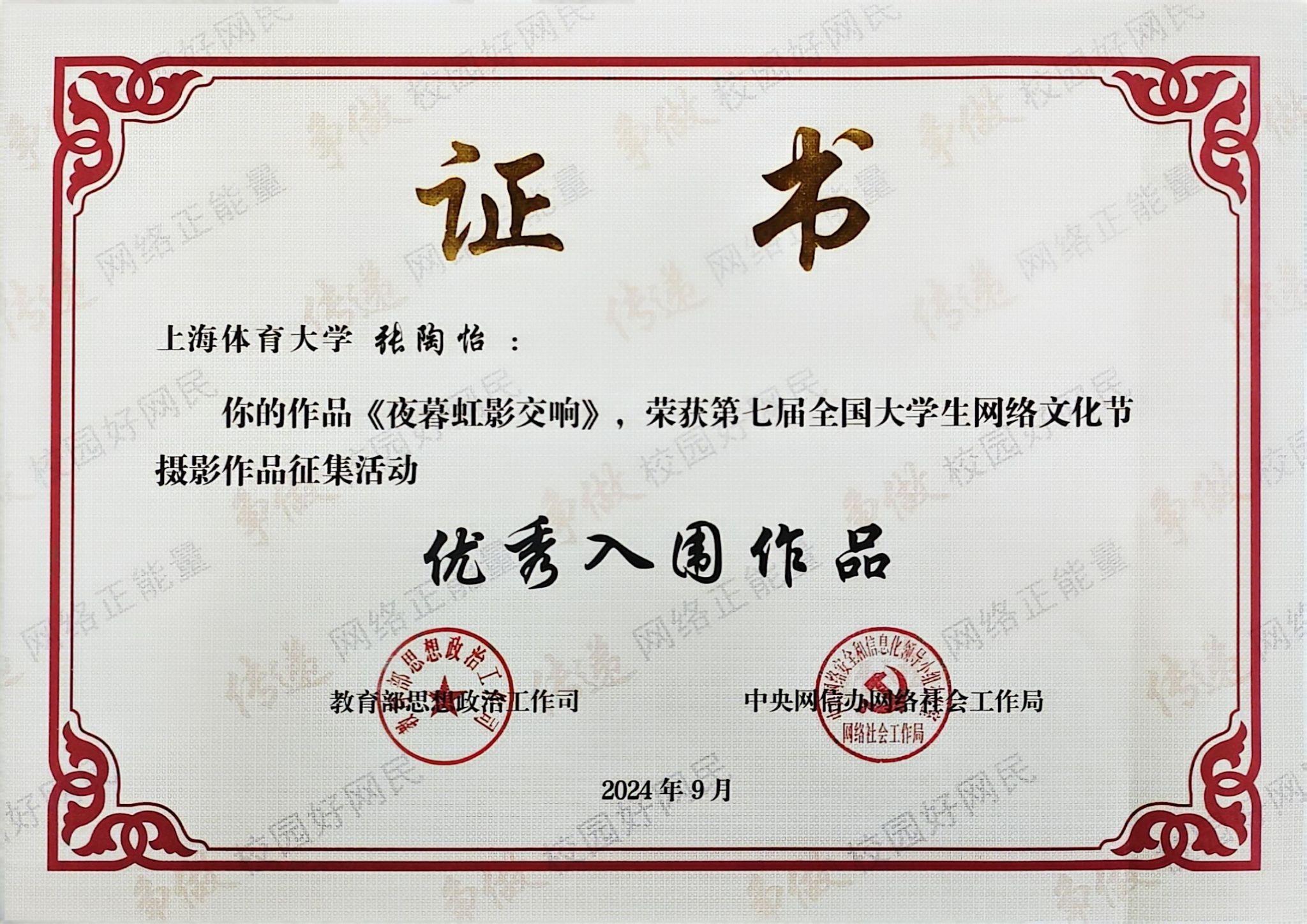 本网讯 近日,教育部思想政治工作司、中央网信办网络社会工作局主办的第七届全国大学生网络文化节评选结果揭晓。红足一1世经济管理学院钟雨诗同学的摄影作品《“浸”情舞蹈》获“优秀推广作品”(最高等级奖),新闻与传播学院张陶怡同学的摄影作品《夜暮虹影交响》获“优秀入围作品”,新闻与传播学院马若楠同学的网文作品《突破时空对话,精神一脉相传:走近大师剧<吴蕴瑞>的独家幕后故事》获“优秀推荐作品”(第三等级奖),红足一1世足球网官方网站荣获第七届全国大学生网络文化节“优秀组织奖”。