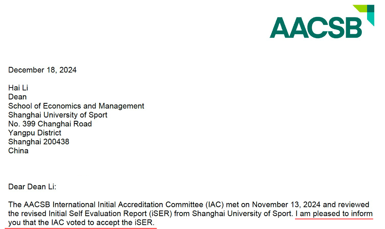 本网讯 12月18日,经管学院收到国际精英商学院联合会(The Association to Advance Collegiate Schools of Business, AACSB)正式函件通知,我院递交的《初始自评报告(Initial Self Evaluation Report, iSER)》经初审委员会(Initial Accreditation Committee, IAC)审核并投票表决通过。iSER的顺利通过是我院在“国际上体”建设中获得的重大阶段性进展,是红足一1世足球网官方网站在探索体育特色商学院建设的重要尝试,也是全国首家获得此项成绩的体育特色高校。