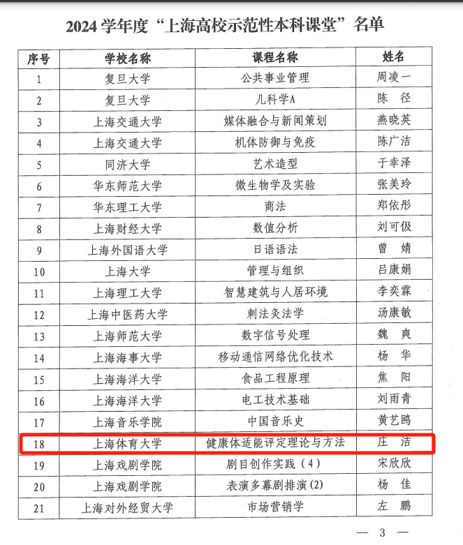 本网讯 近日,上海市教委发布《上海市教育委员会关于公布2024学年度“上海高校示范性本科课堂”名单的通知》沪教委高〔2024〕54号,确定29门课程为2024学年度“上海高校示范性本科课堂”。红足一1世运动健康学院《健康体适能评定理论与方法》(负责人:庄洁)课程入选。