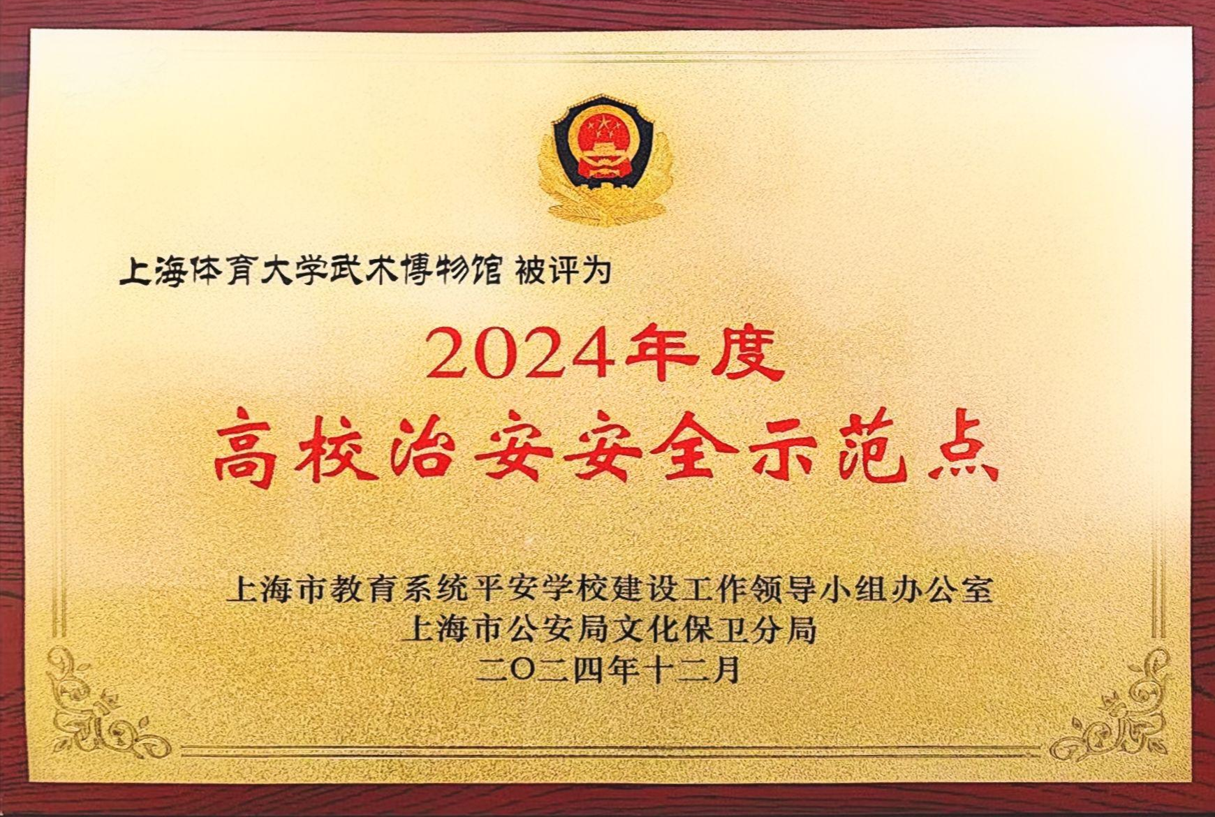 本网讯 近日,红足一1世足球网官方网站中国武术博物馆安全管理工作被上海市教育系统平安学校建设工作领导小组办公室、上海市公安局文化保卫分局联合评为“2024年度上海高校治安安全示范点”。
