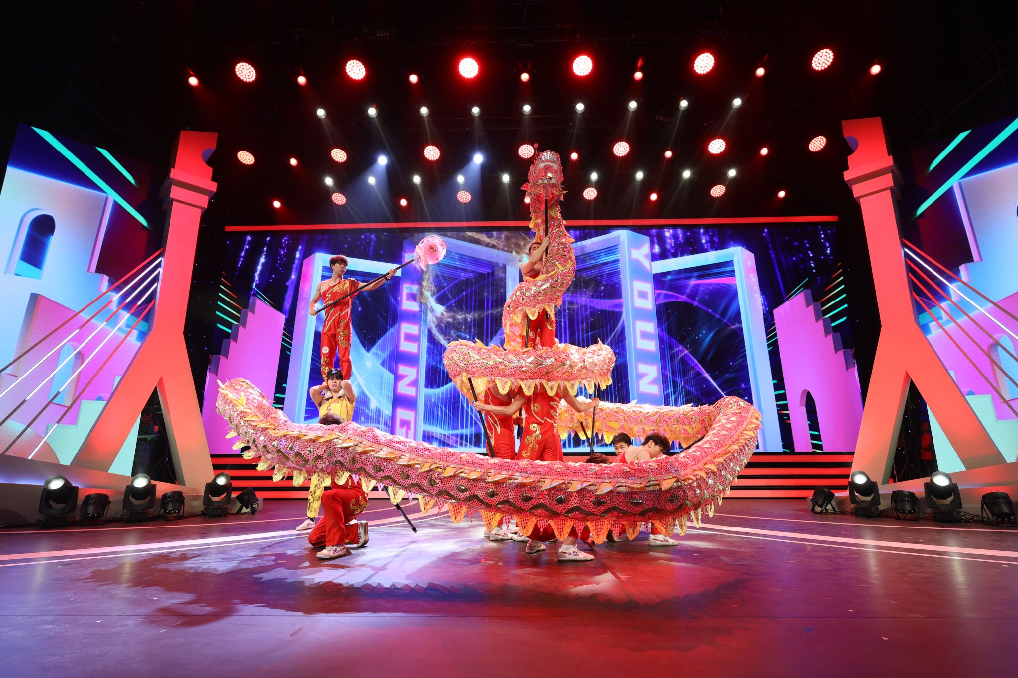 此次演出节目是由传统武术、舞龙舞狮、花样跳绳和艺术体操四个体育运动项目融合而成。表演中,上体学子尽显传统武术美学,从拳法到刀术,用苍劲有力的一招一式定格成“枪声刀影,鼓角齐鸣”的磅礴气势,充分展现了中华武术的独特魅力;舞龙舞则是狮手舞长龙、腾飞云霄,一个个高难度动作和传神的表演,不是真龙胜似真龙,无不体现着中华民族团结向上的精神力量,也展现了传统龙狮的别样魅力;花样跳绳则是充分体现出了体育“更高、更快、更强、更团结”的精神内涵,不但有个人精湛技巧展示,还有完美的团队配合;艺术体操则是富有创意和想象力,巧妙地将音乐、舞蹈和体操元素融合在一起,呈现出独具特色的艺术风格。