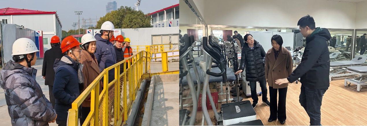 党委副书记、校长毛丽娟和副校长魏建军考察在建的游泳球类馆和体能实验室等