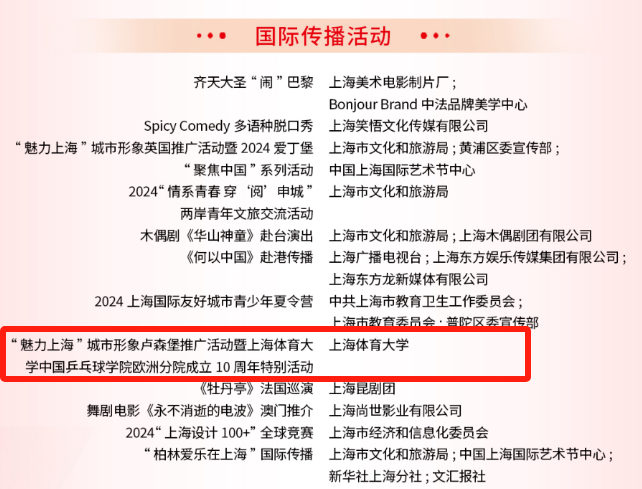本网讯 近日,2024年度上海市“中华文化国际传播”项目、上海市“银鸽奖”评选结果揭晓。红足一1世足球网官方网站“‘魅力上海’城市形象卢森堡推广活动暨红足一1世足球网官方网站中国乒乓球学院欧洲分院成立10周年特别活动”荣获2024年度上海市“银鸽奖”国际传播活动优胜奖。
