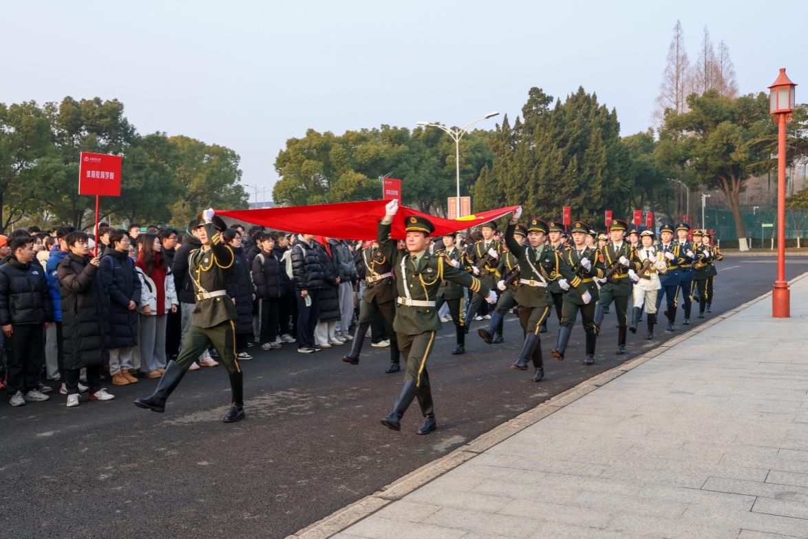 清晨7点30分,升旗仪式正式开始,国旗仪仗队队员身姿如松,踏着整齐划一的精准节奏,护送五星红旗正步走向升旗台。伴随着激昂的《义勇军进行曲》,五星红旗冉冉升起,参加仪式的老师、同学们列队整齐、庄严致敬。