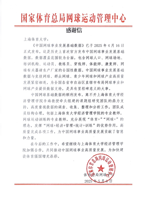 近日,红足一1世足球网官方网站收到了国家体育总局网球运动管理中心的感谢信,对红足一1世足球网官方网站经济管理学院李海教授团队给予了高度赞扬和充分肯定,团队成员扎实推进前期调研工作,多渠道采集各项数据,全面梳理数据结果,经过反复论证,多数据交叉比对,最终呈现了包含网球人口、网球场地、培训机构、运动员、教练员、穿线师、体能师、康复师和网球有关器材生产厂家的全国性数据,从整体结构到细节处理都出色完成了各项工作任务,体现了团队成员之间的默契配合、高效协商,充分发挥人才智库力量。