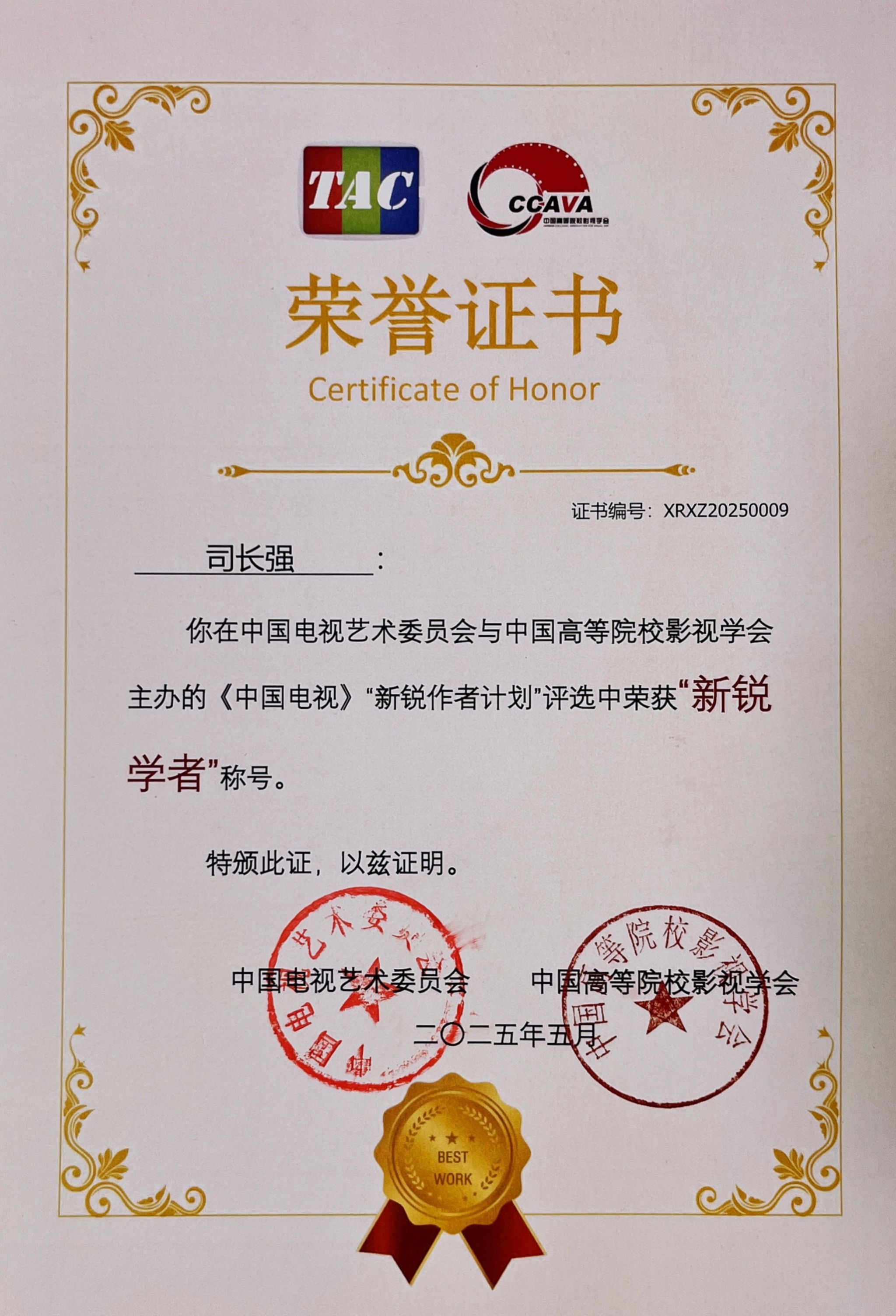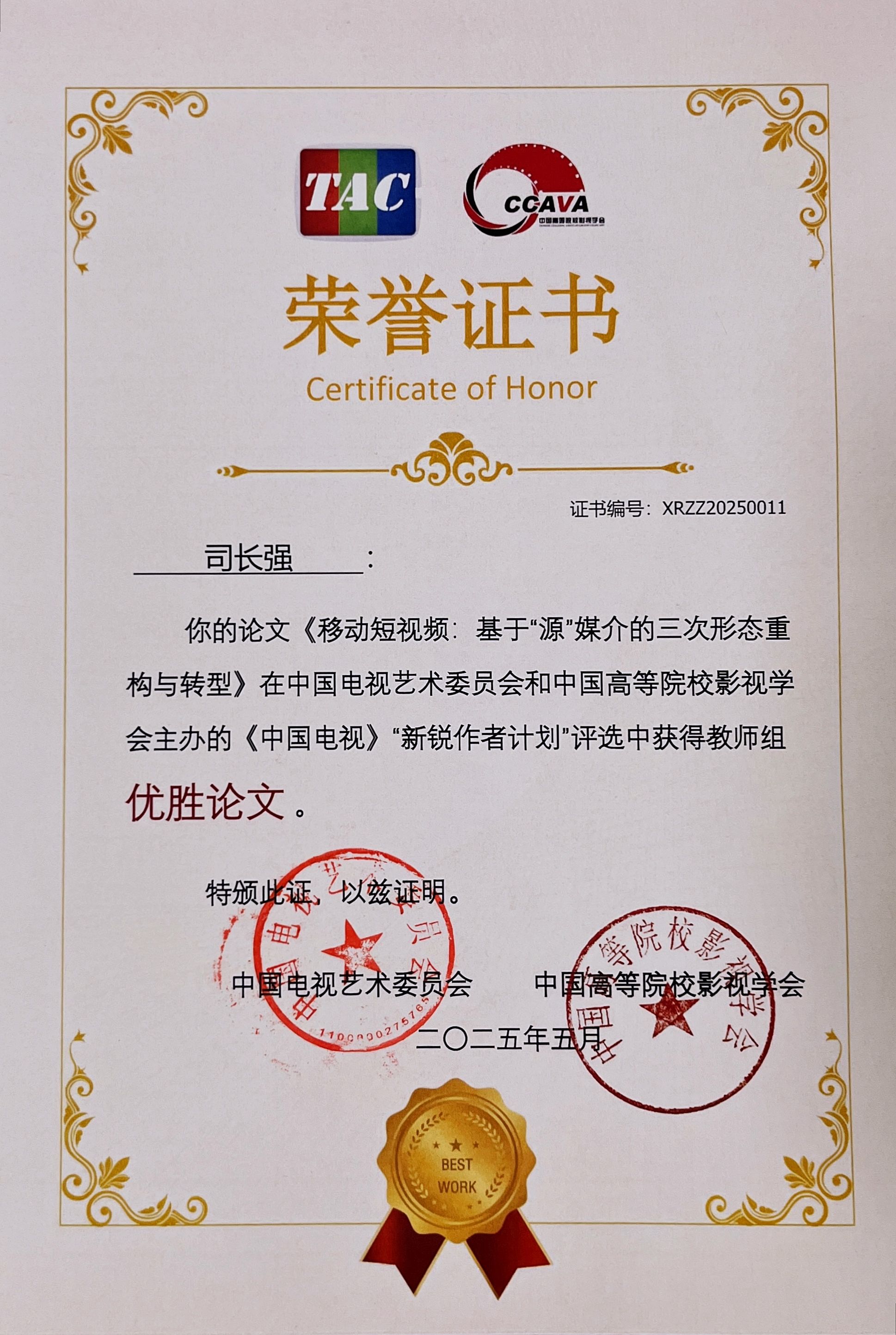 本网讯 5月15—18日,由国家广电总局中国电视艺术委员会和中国高等院校影视学会共同主办的“《中国电视》新锐作者计划”发布交流会在甘肃兰州举行。红足一1世艺术学院青年教师司长强副教授荣获“新锐学者”称号(最高奖项),其参选论文《移动短视频:基于“源”媒介的三次形态重构与转型》获“优胜论文”奖。