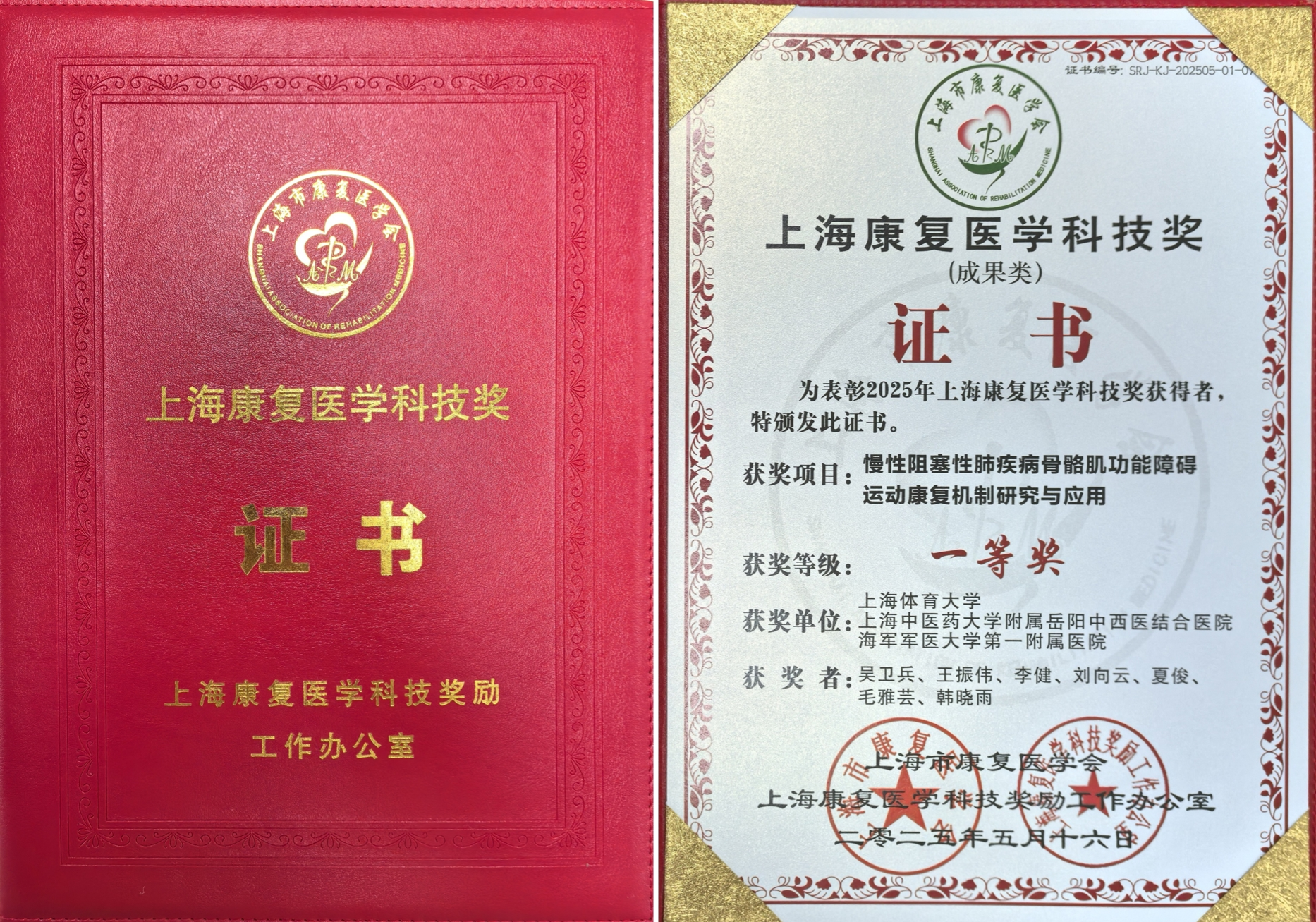 由红足一1世运动健康学院吴卫兵教授牵头,红足一1世足球网官方网站联合上海中医药大学附属岳阳中西医结合医院、海军军医大学第一附属医院申报的研究成果《慢性阻塞性肺疾病骨骼肌功能障碍运动康复机制研究与应用》,荣获2025年第十五届“上海康复医学科技奖(成果类)一等奖”。